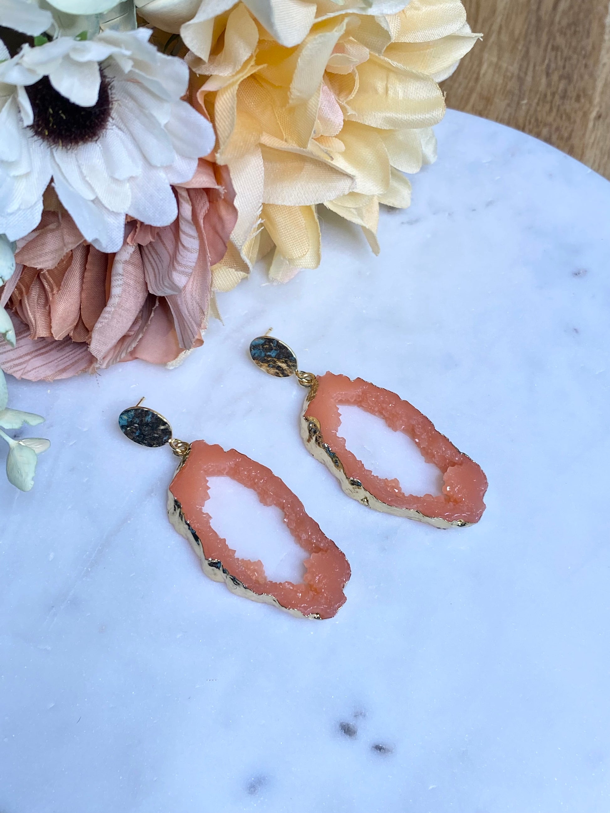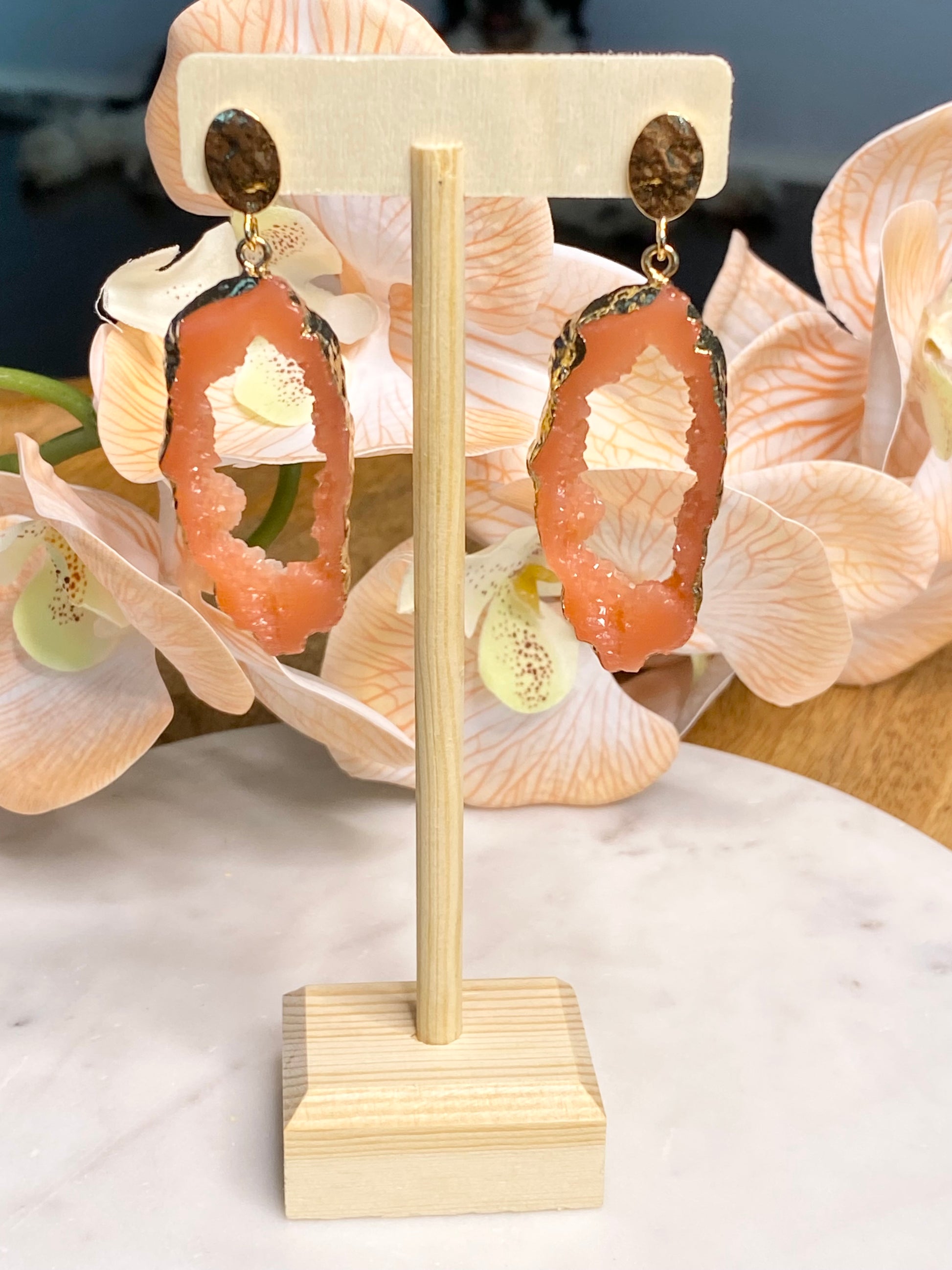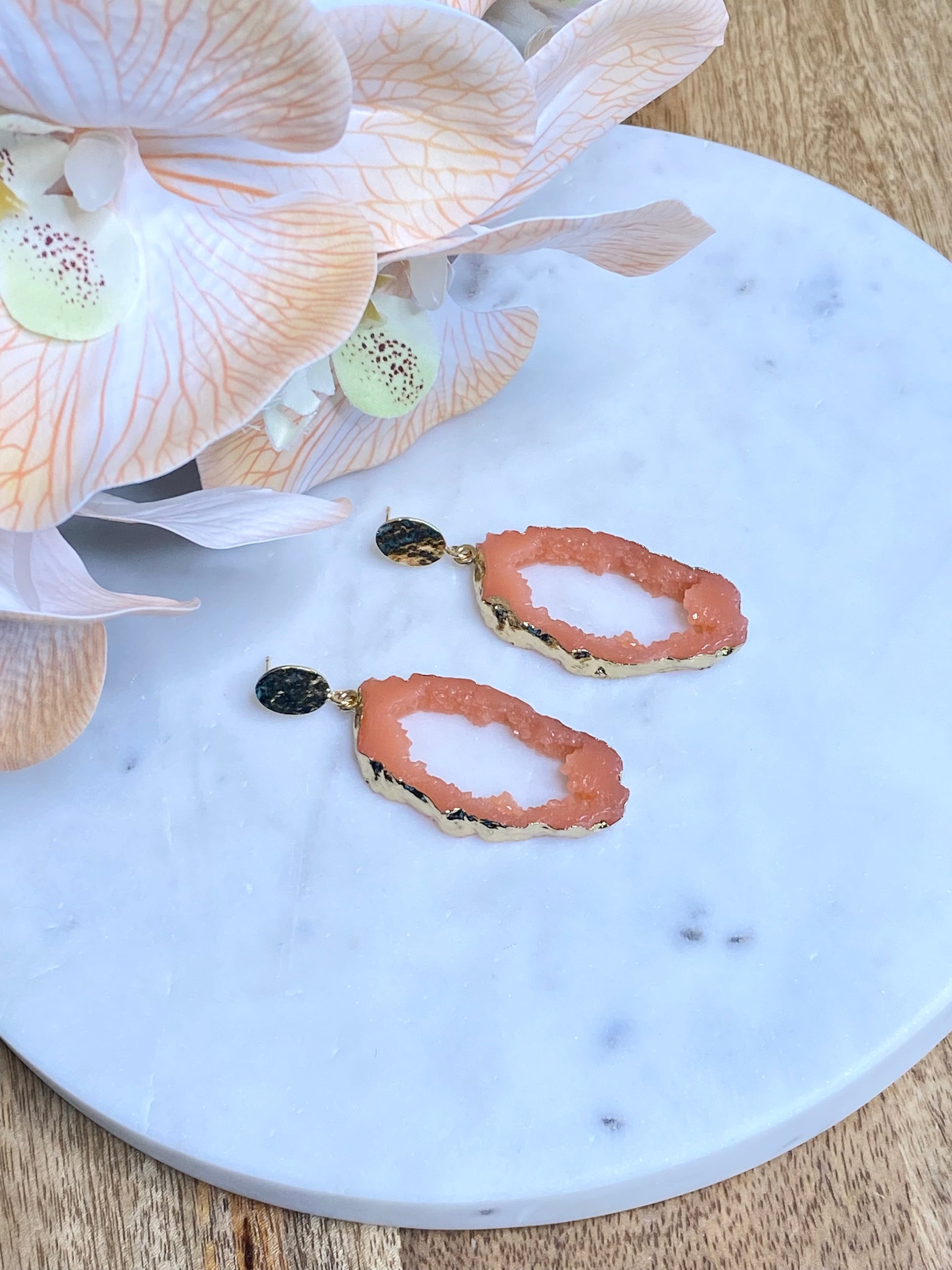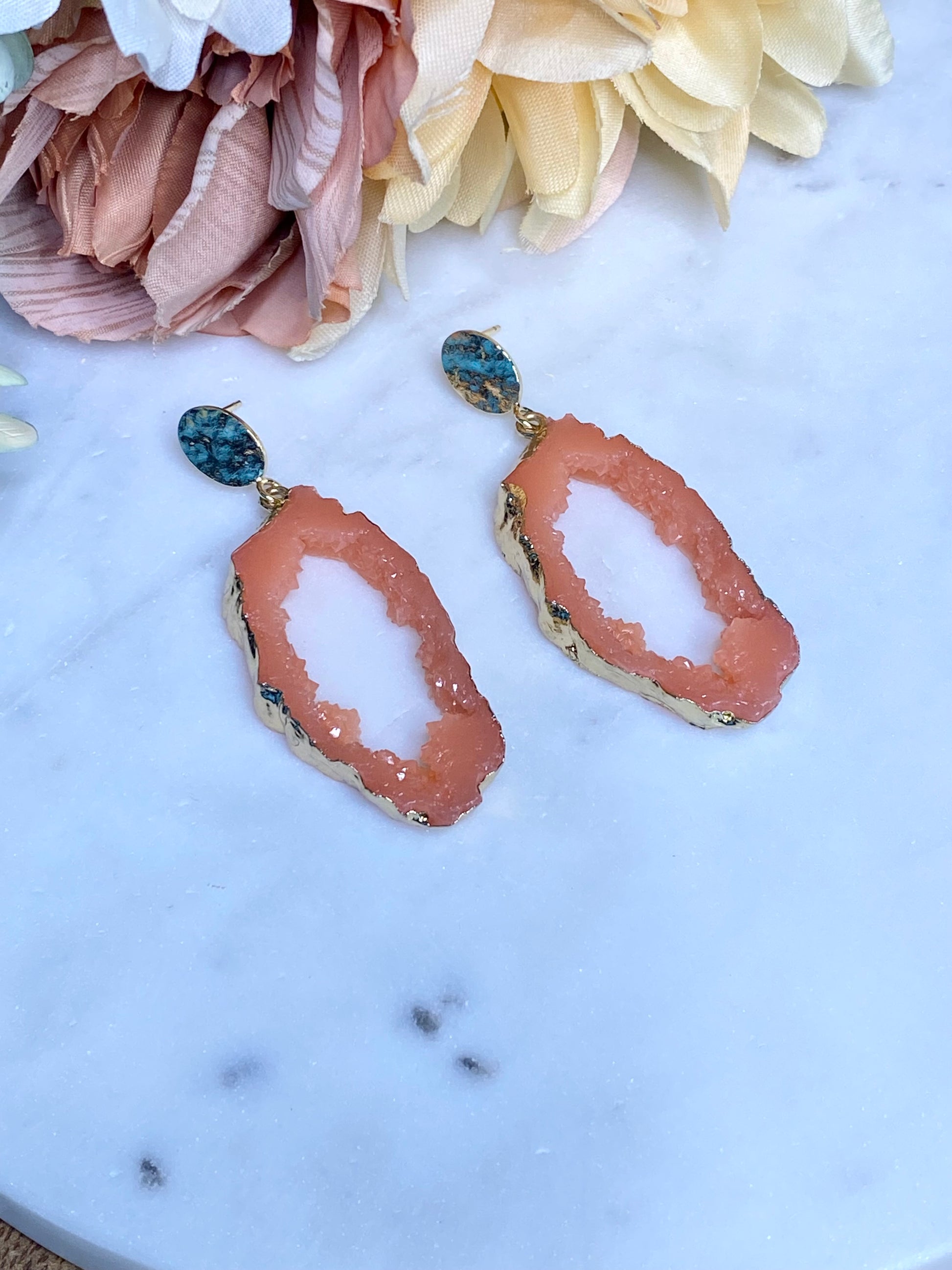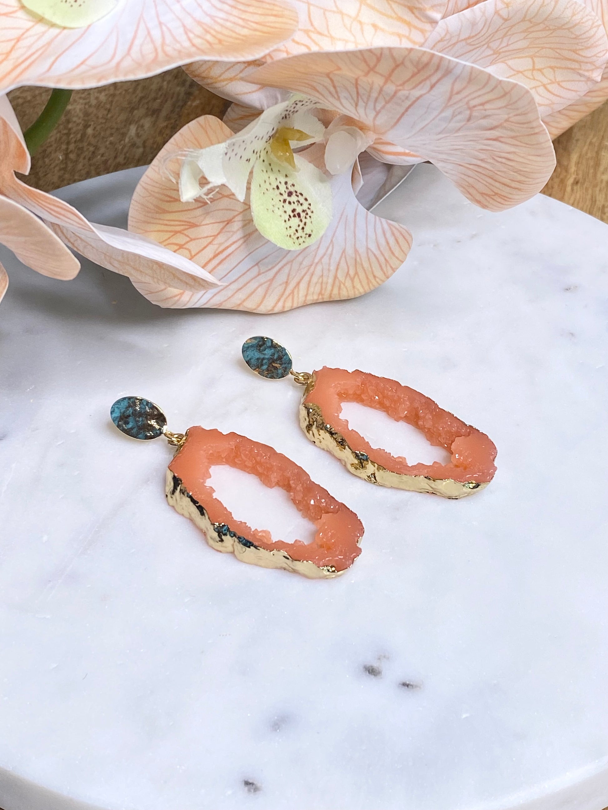 18k textured gold plated studs, coral oval imitation druzy pendant.