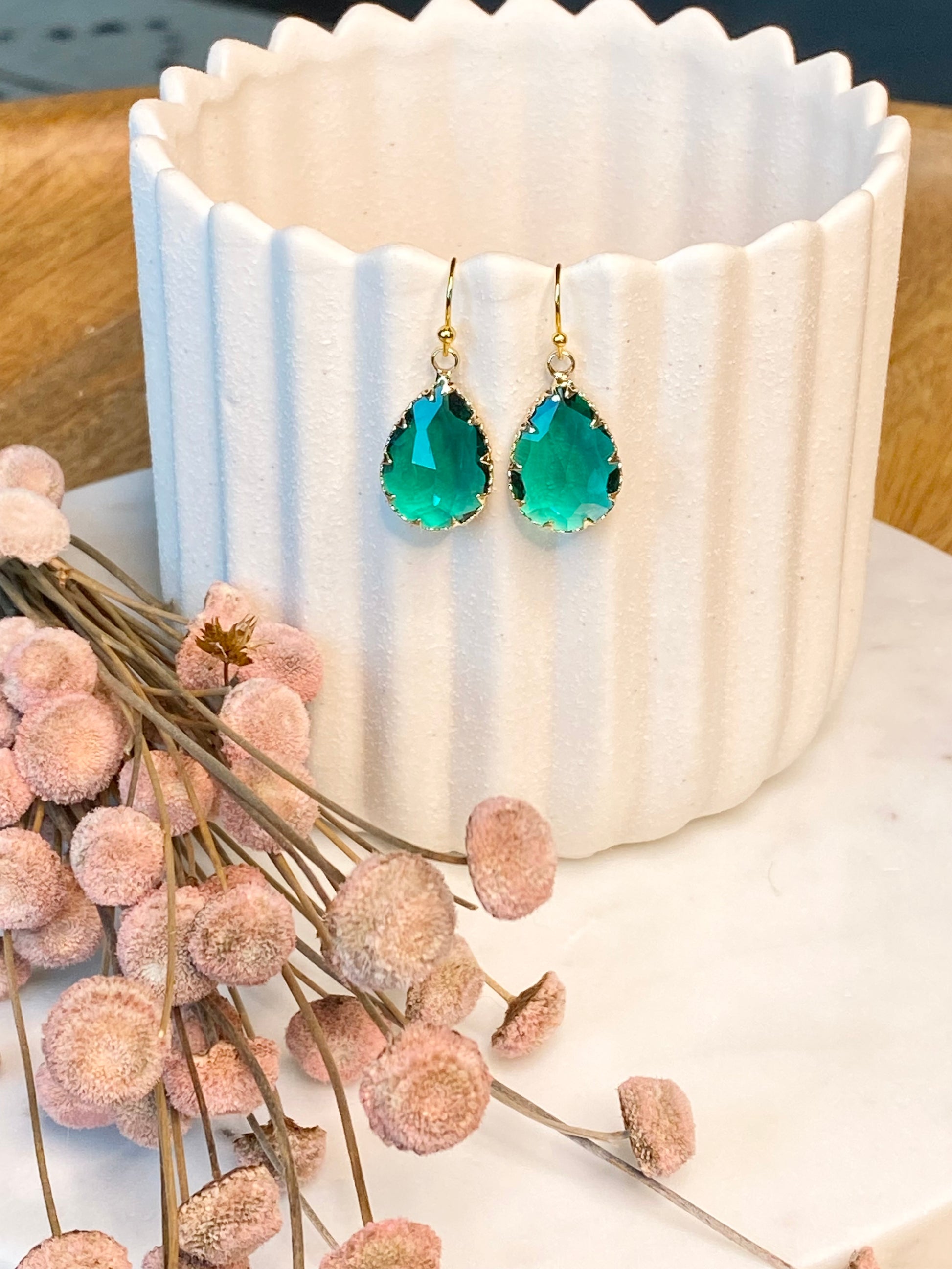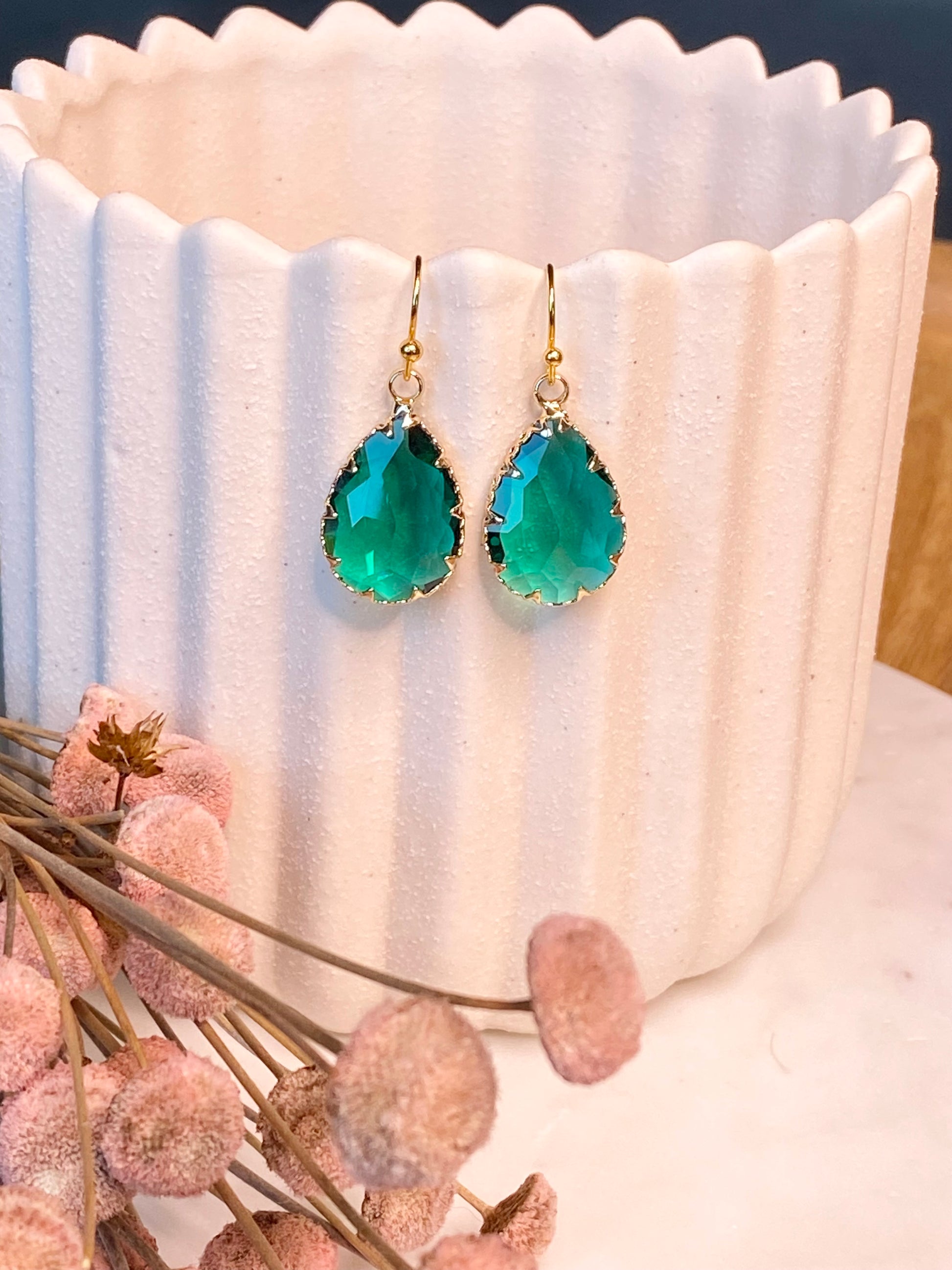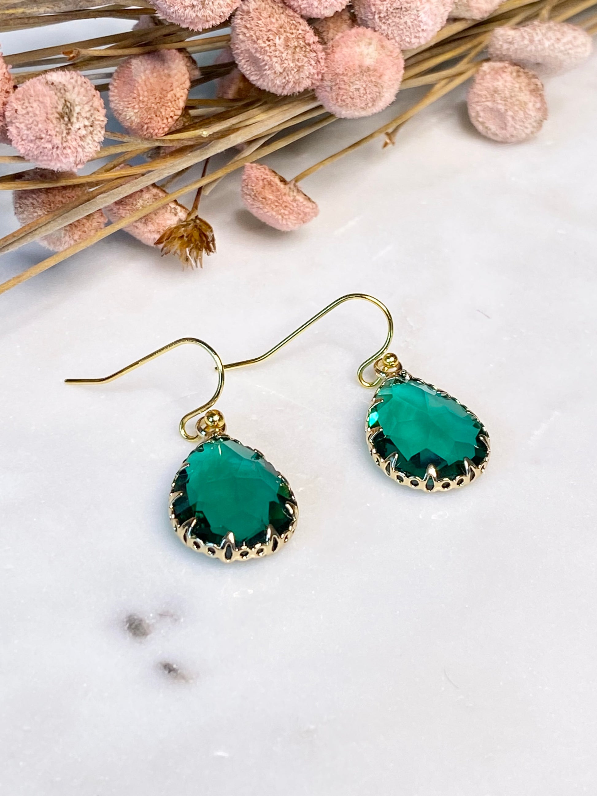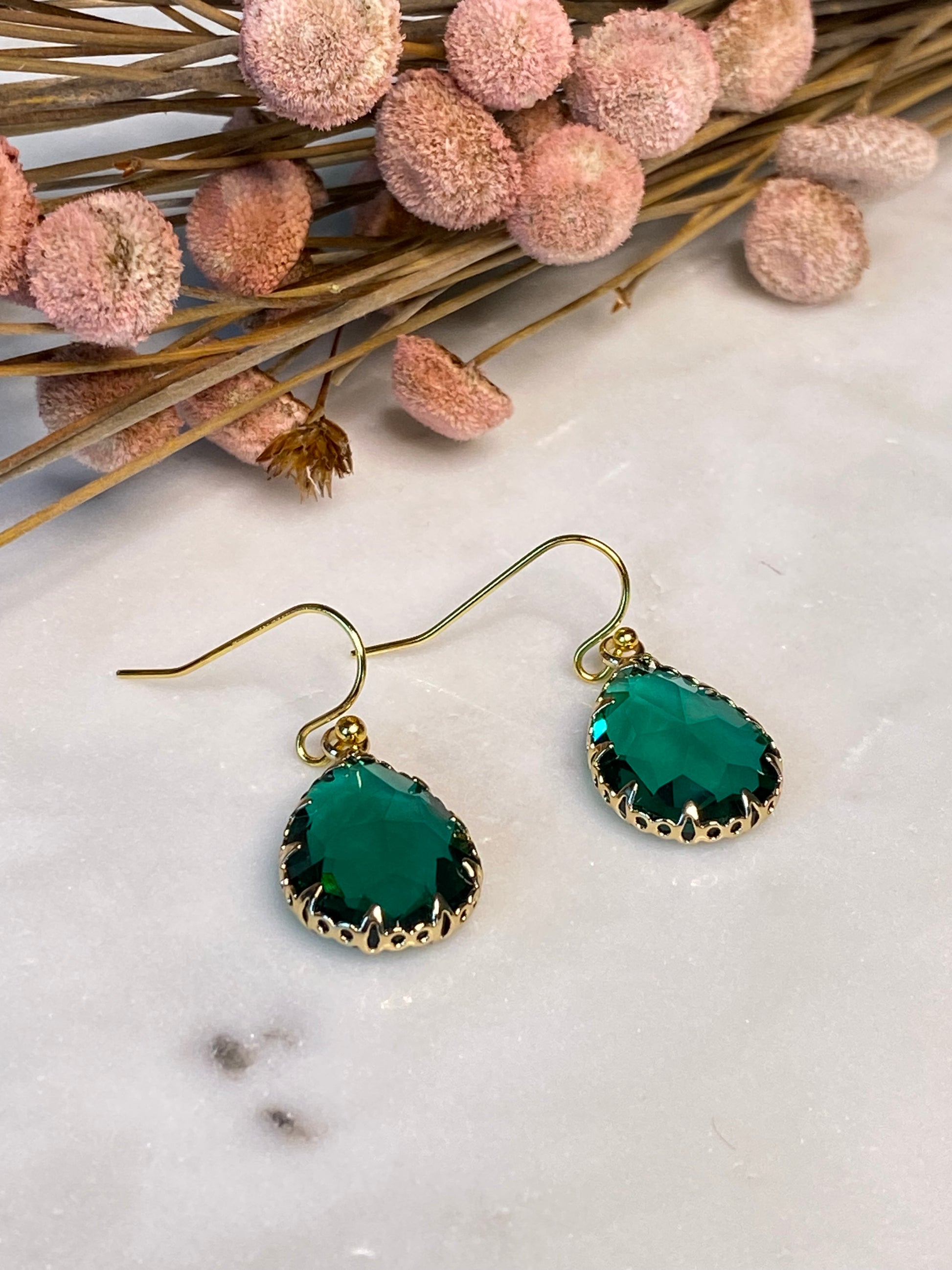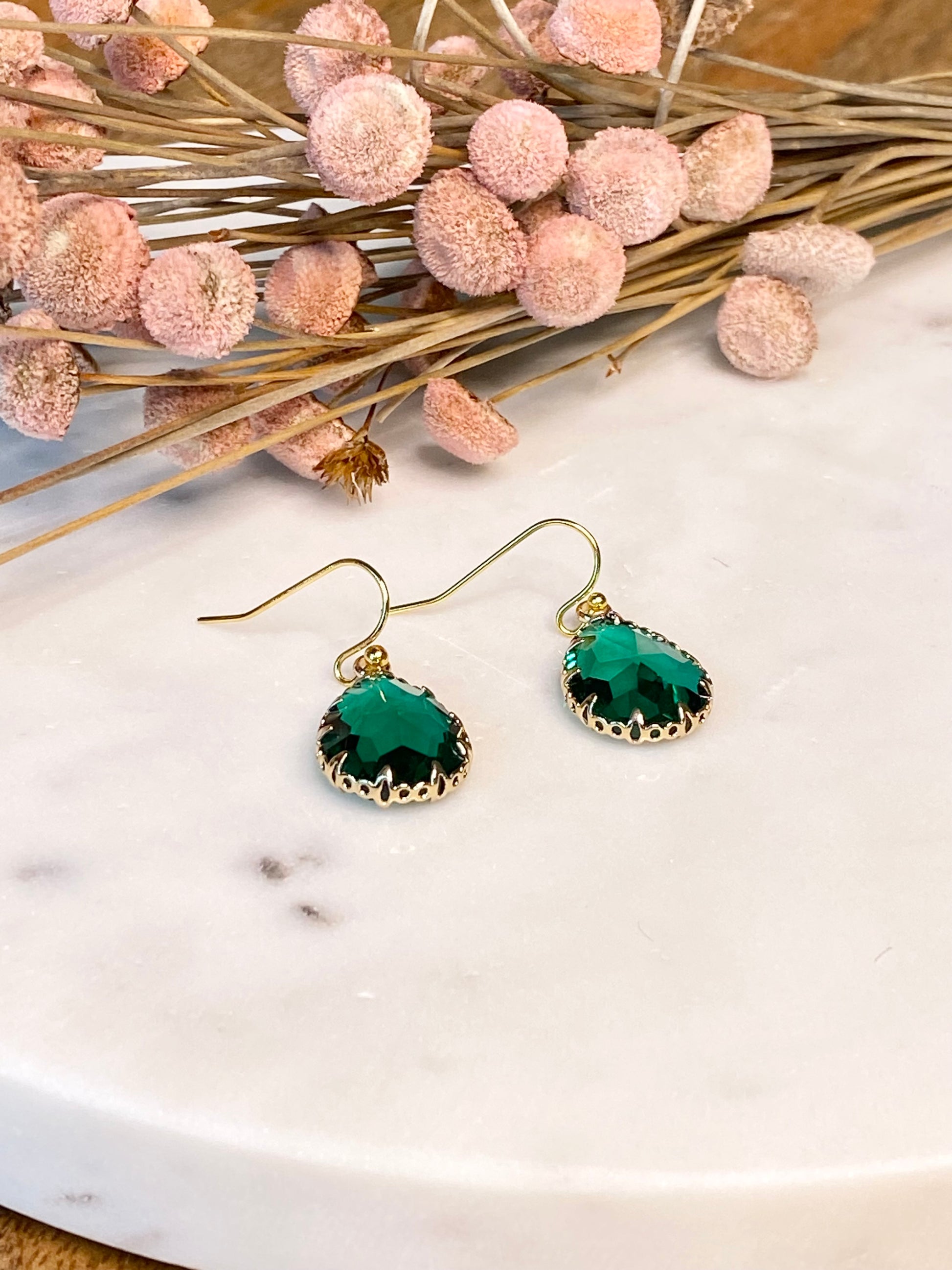 - Gemstone: Emerald Green Crystal Glass Encased in Brass