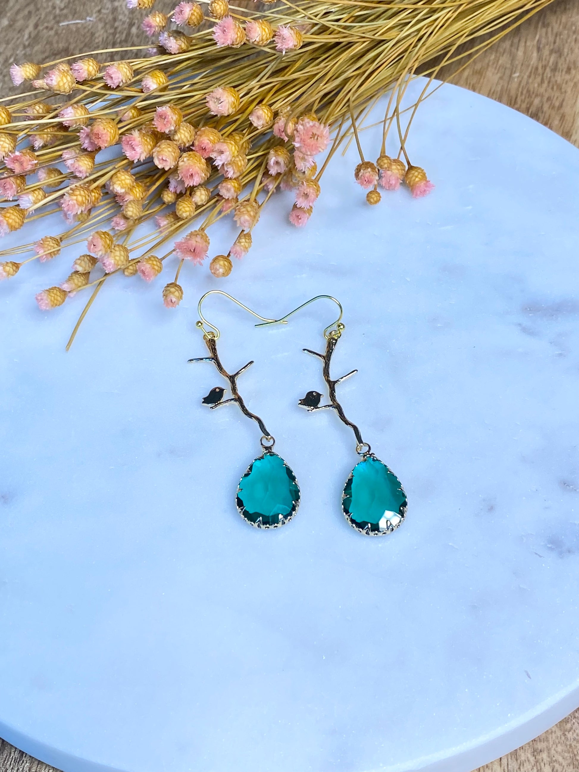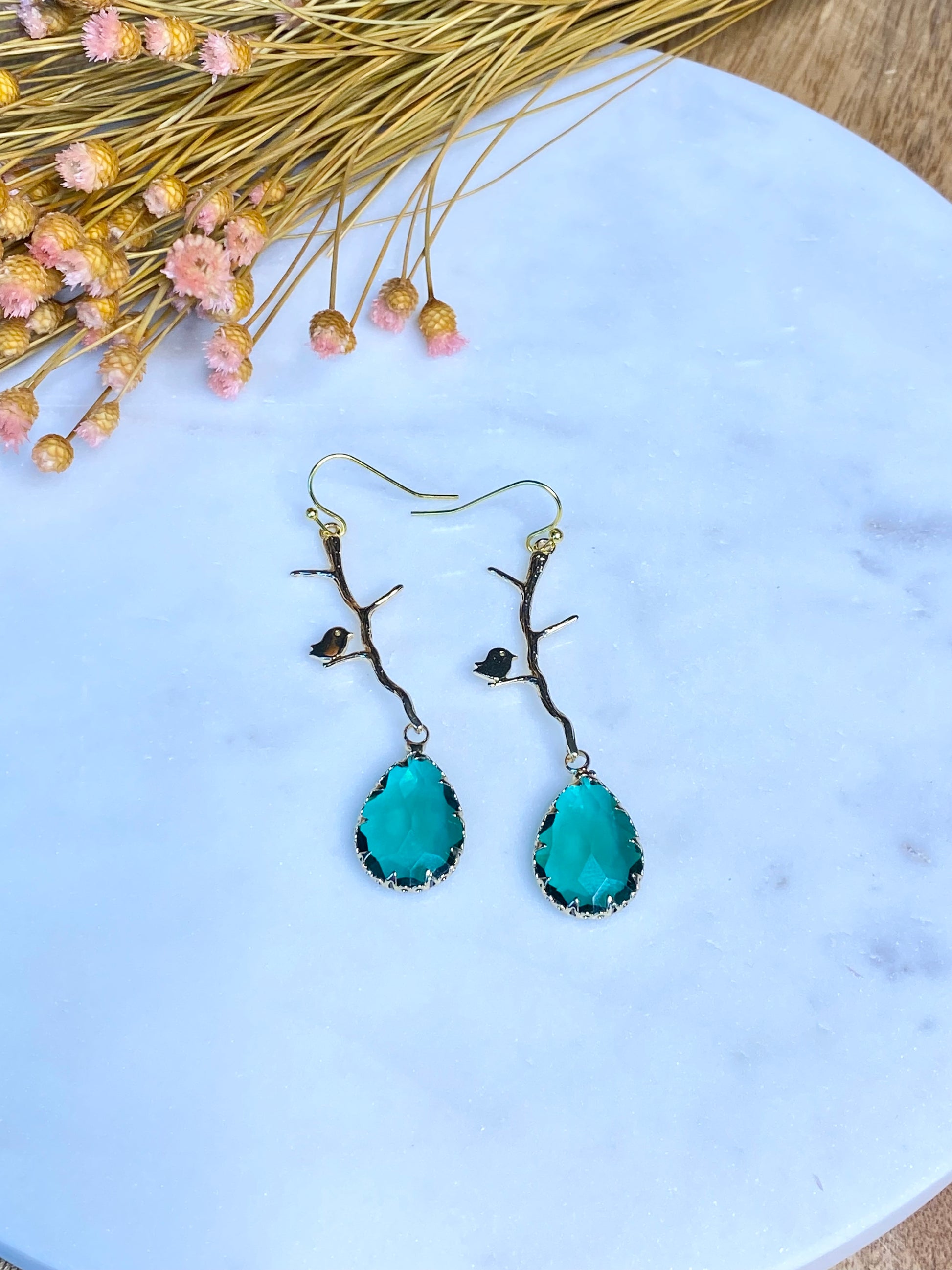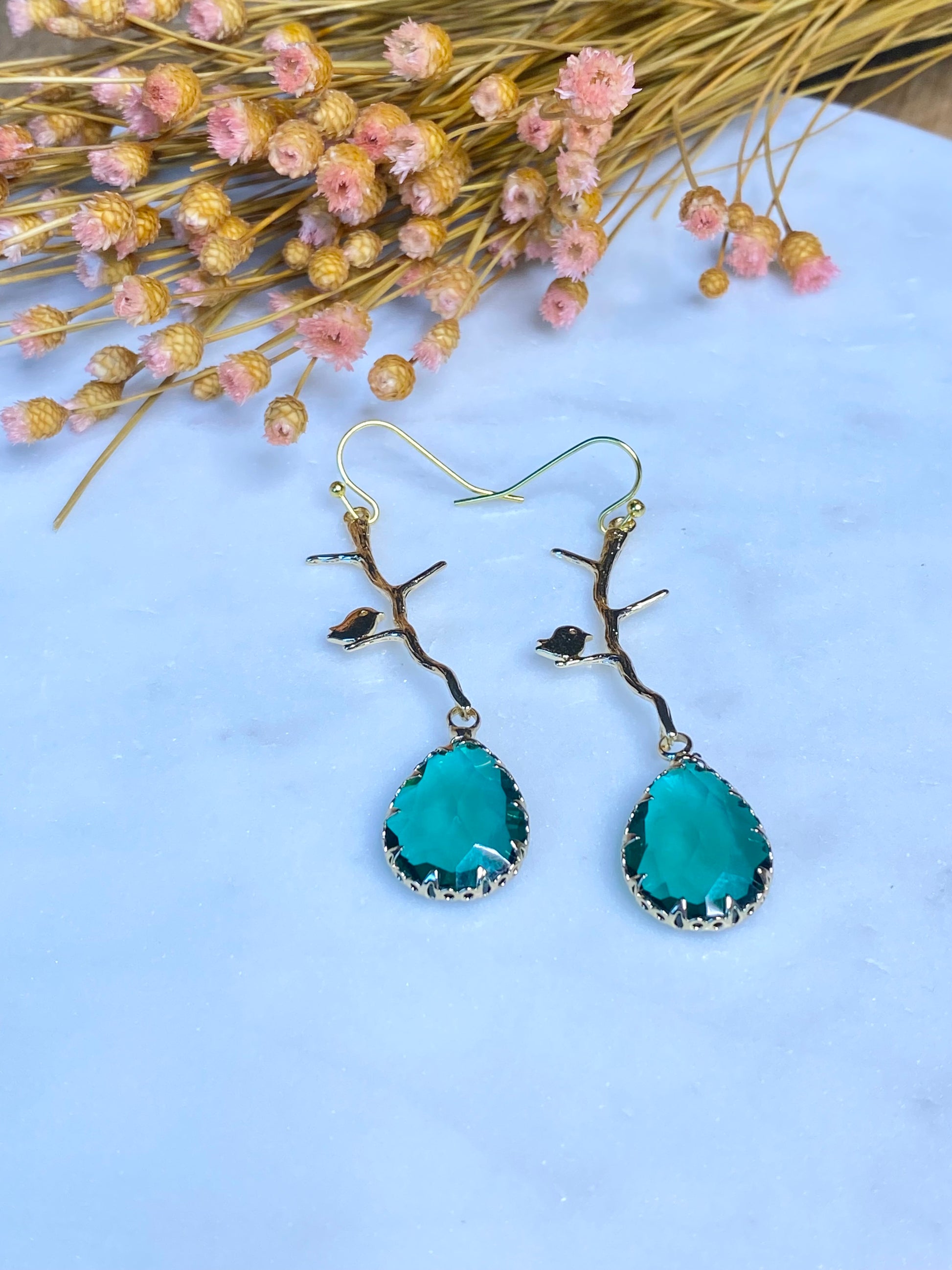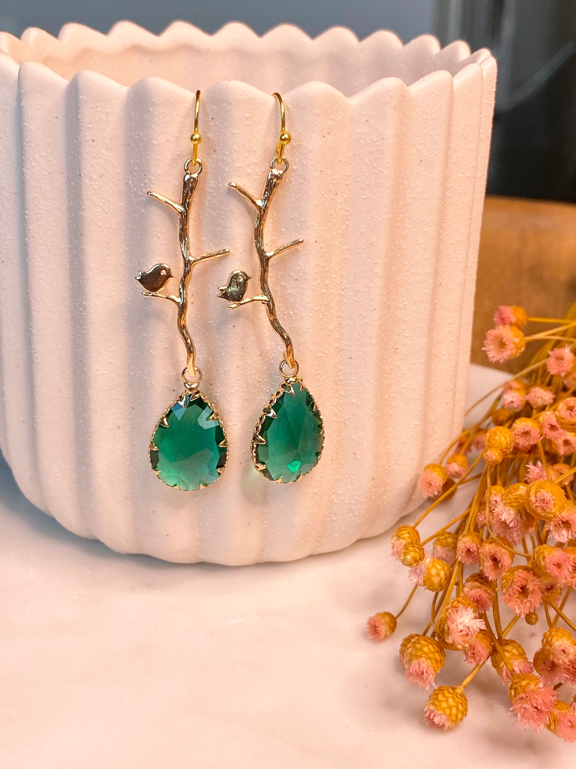 Real gold plated tree branch with perched bird, emerald green crystal glass gemstone.