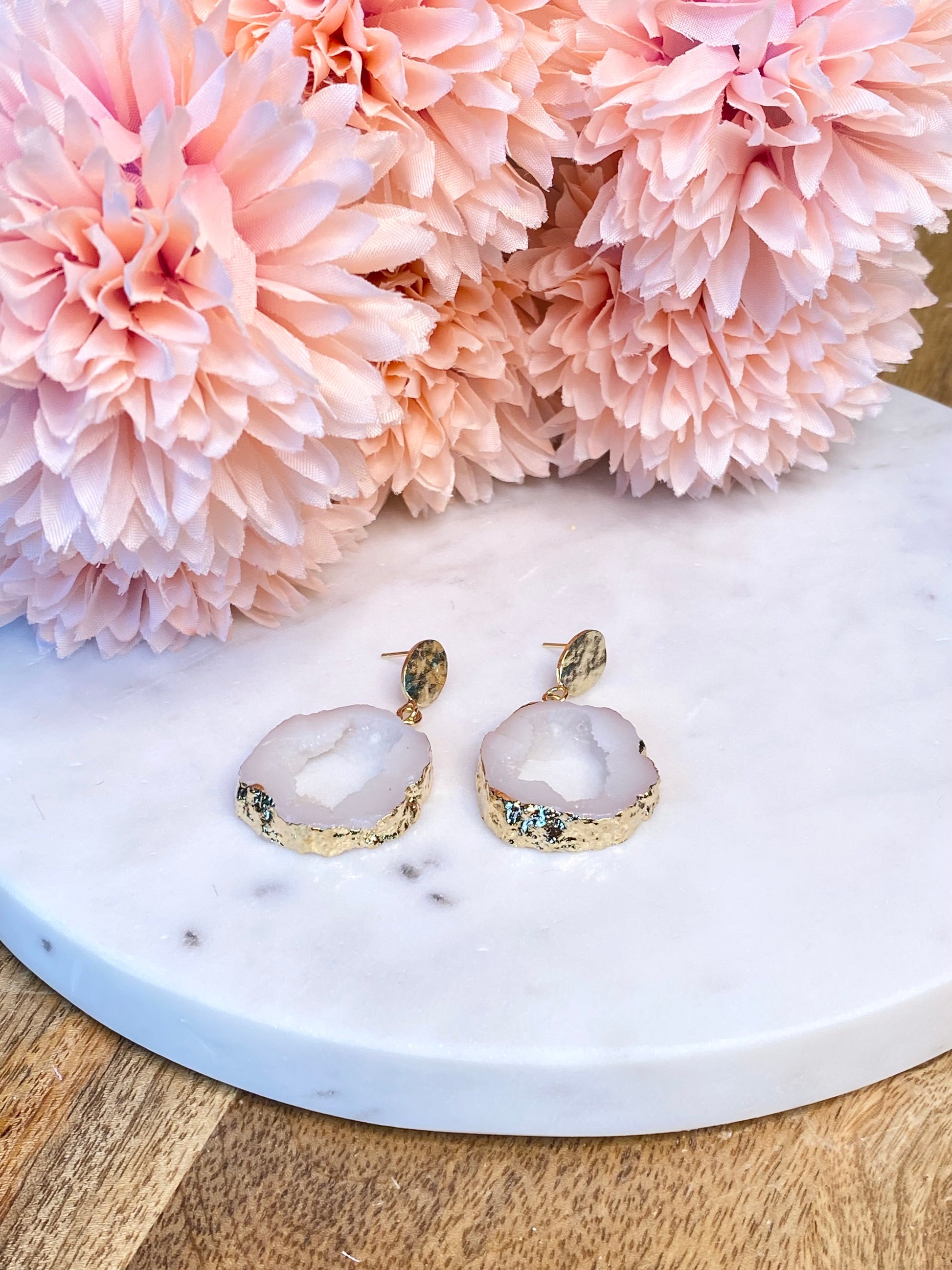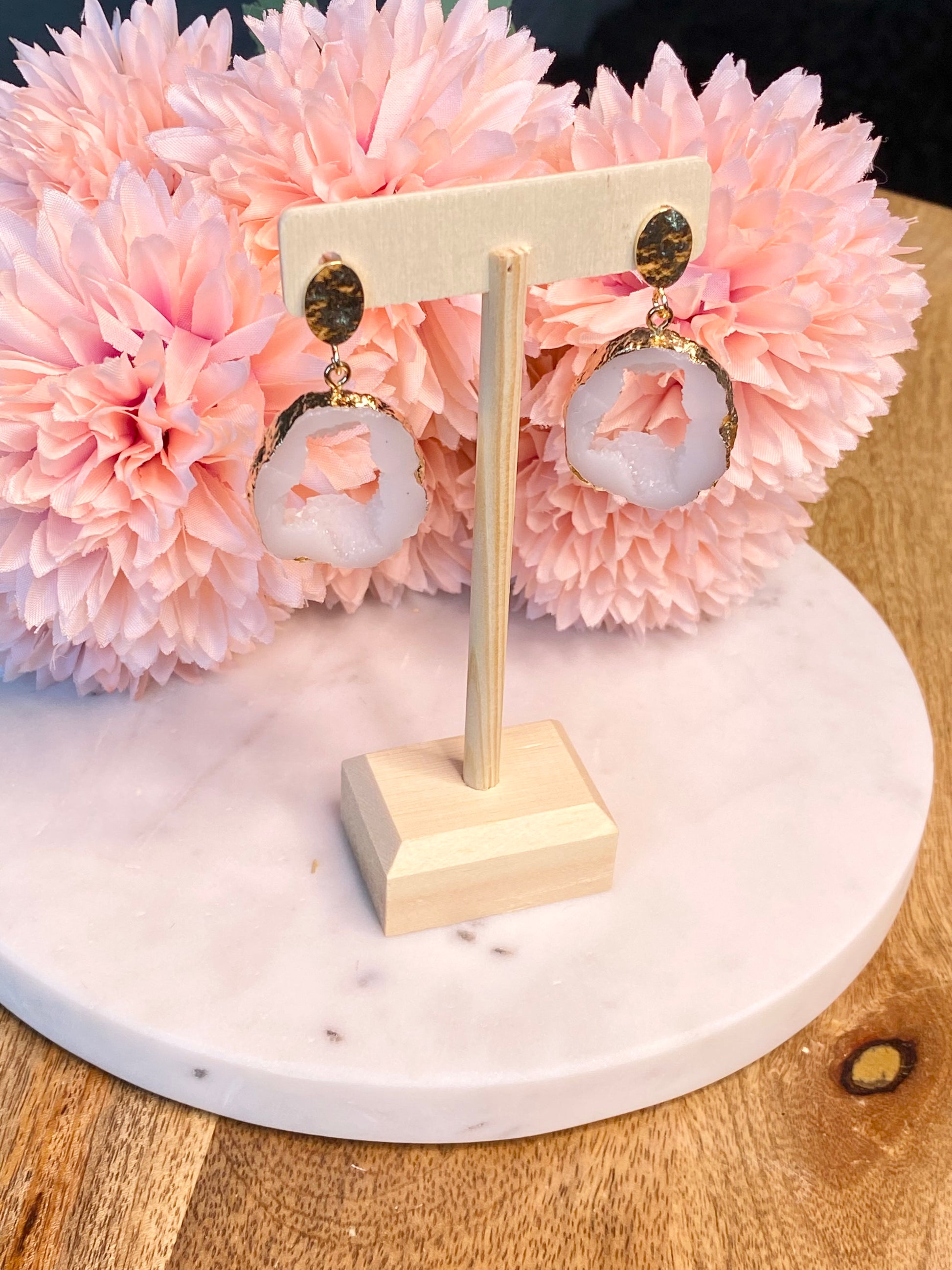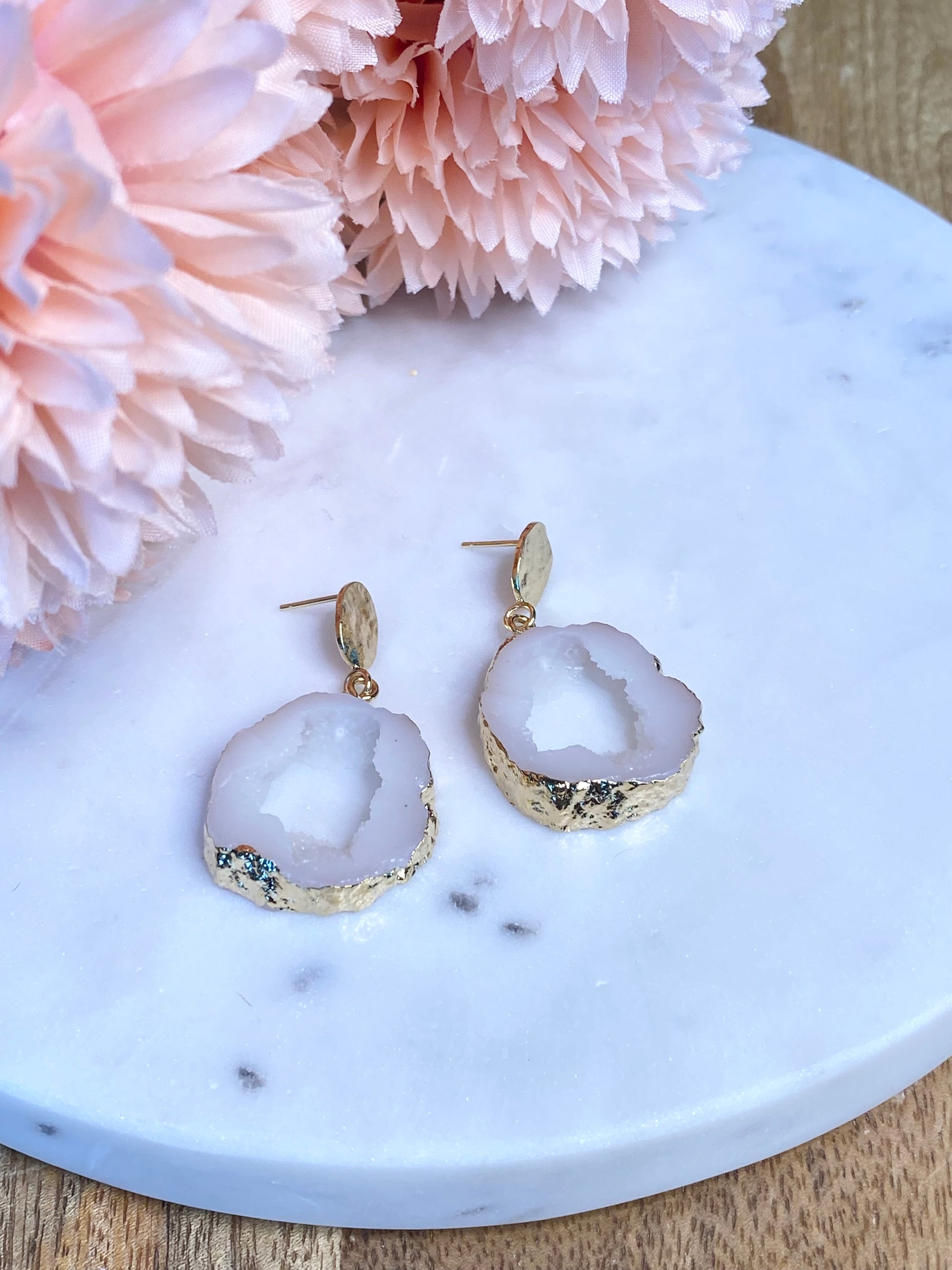 18k textured gold plated studs, white oval imitation druzy pendant.
