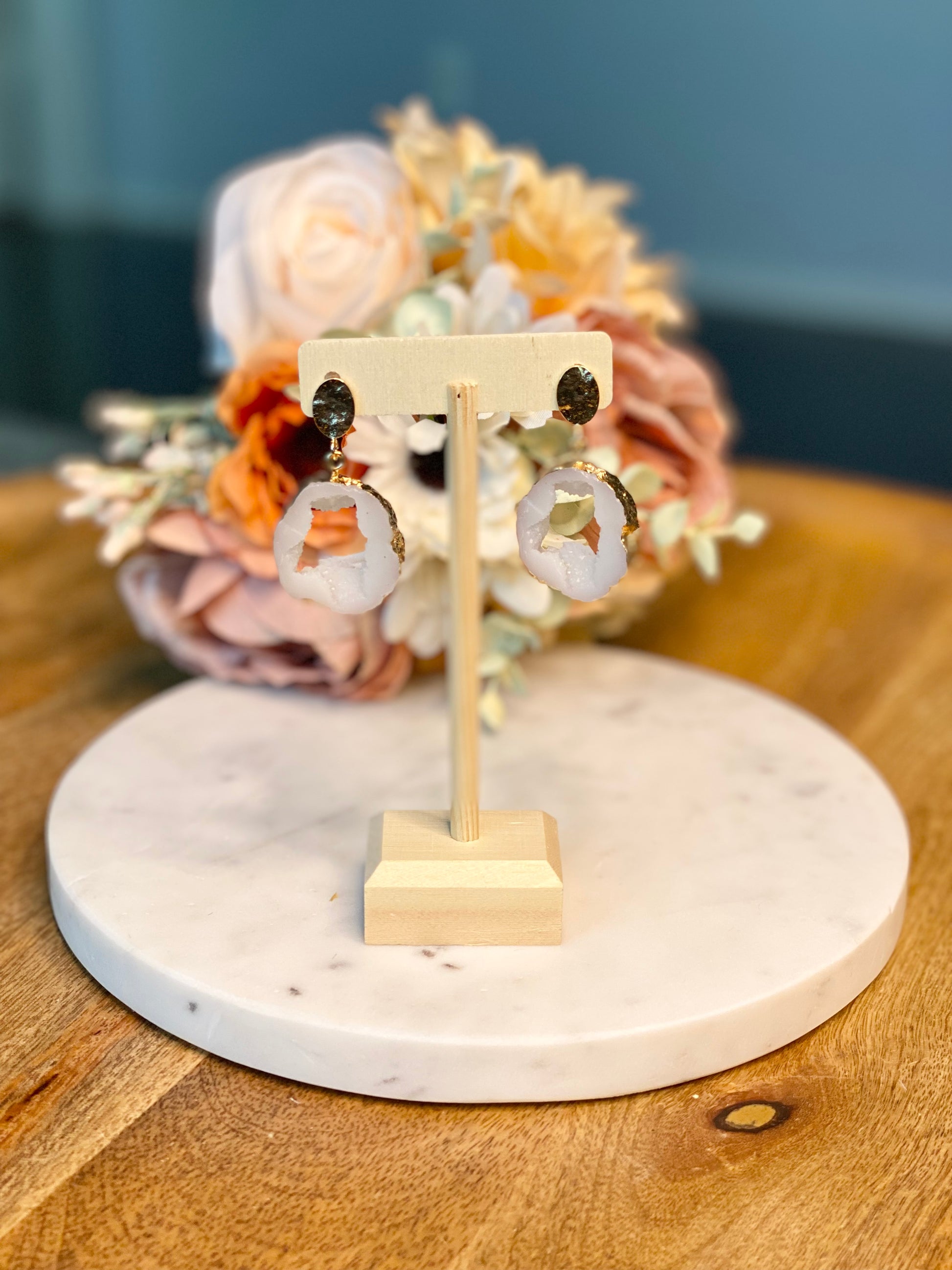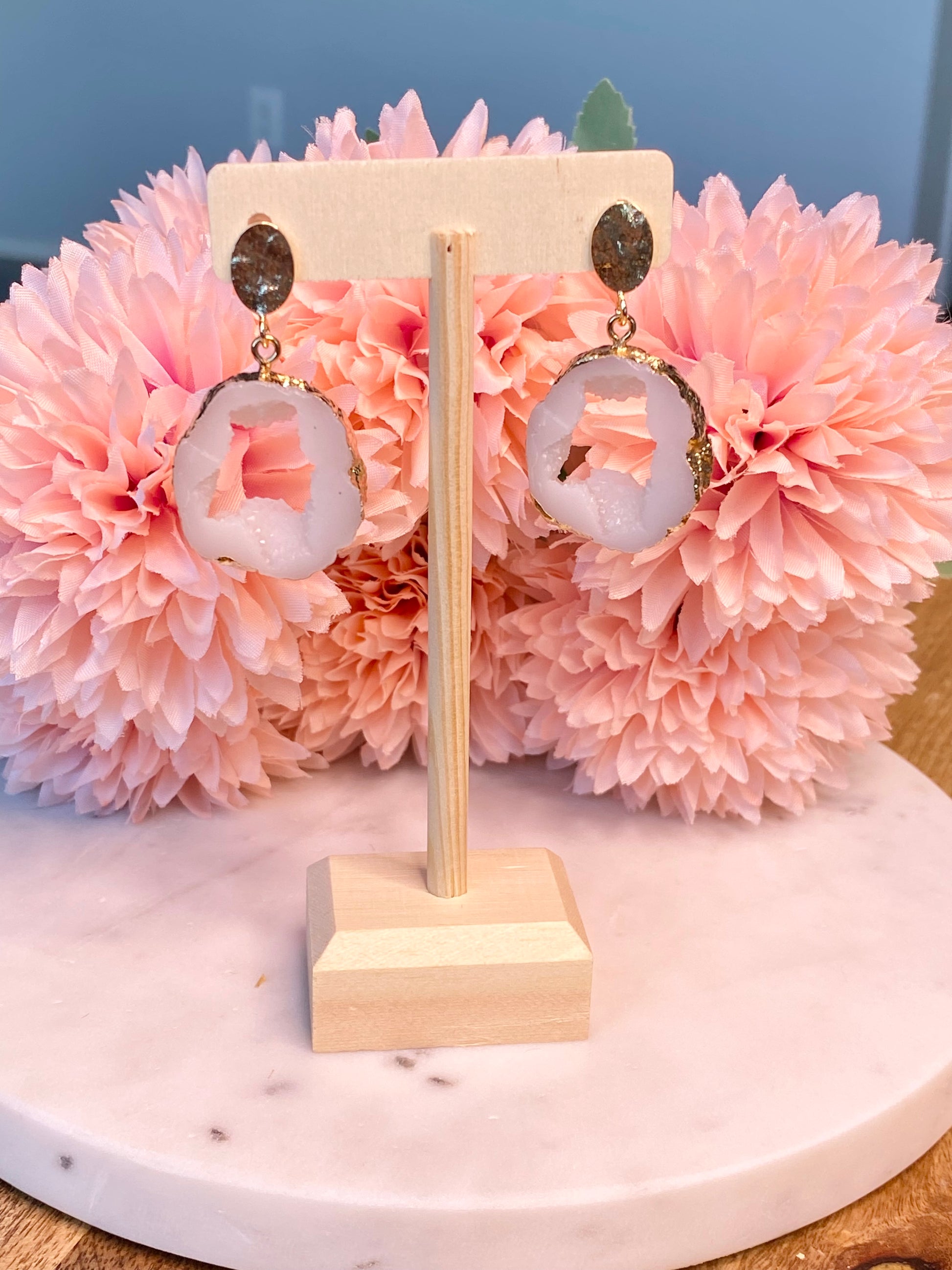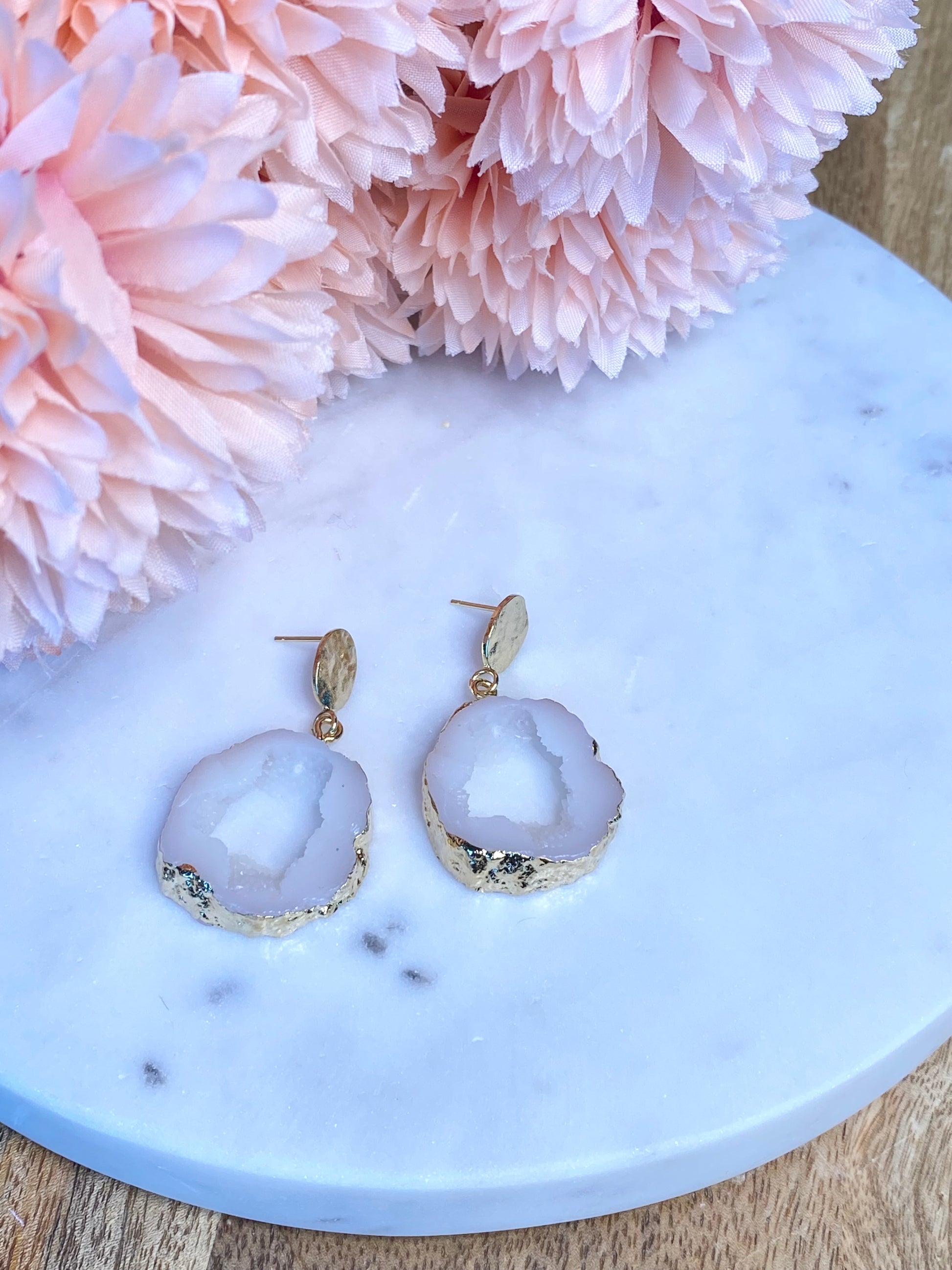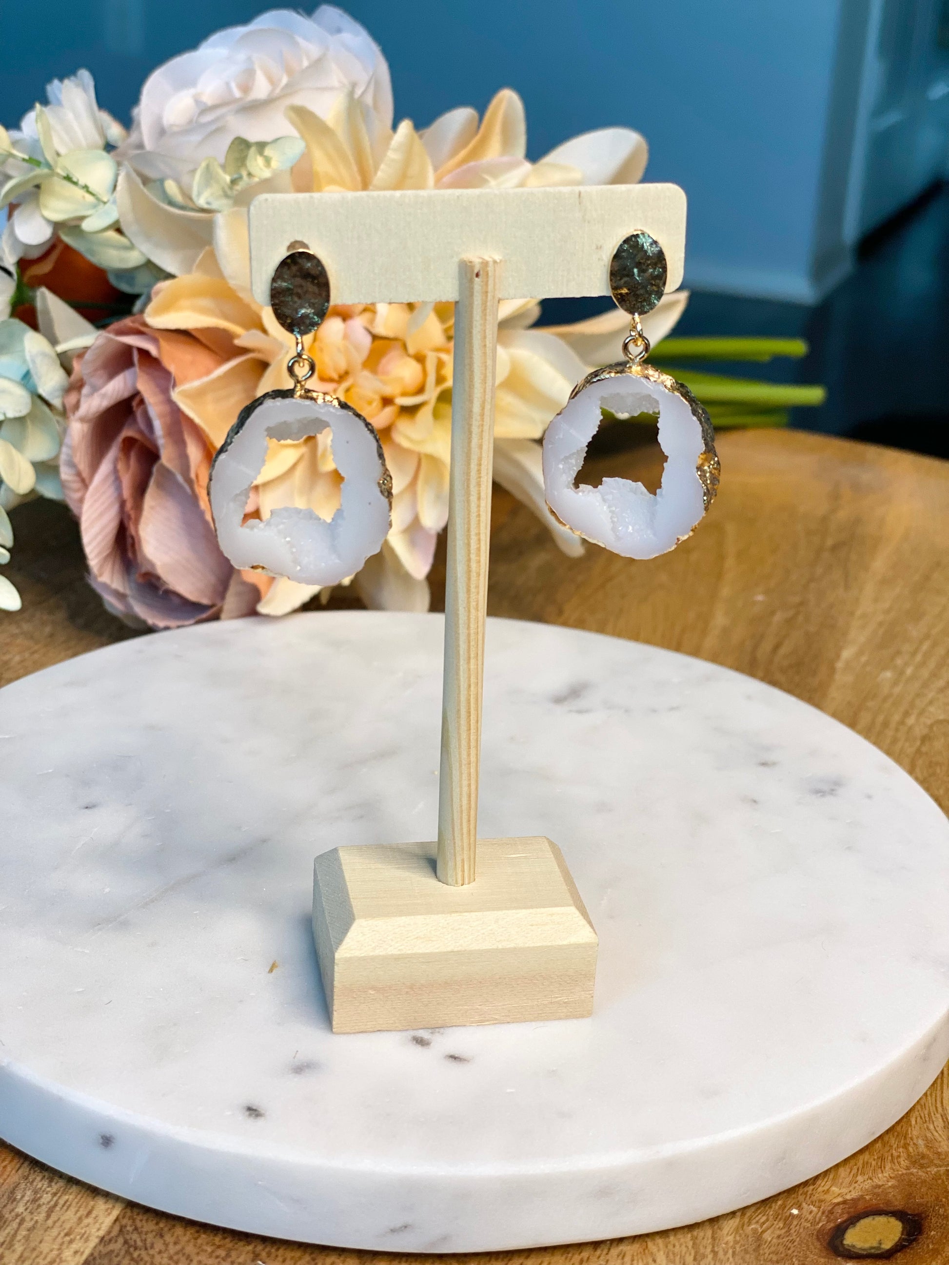 18k textured gold plated studs, white oval imitation druzy pendant.