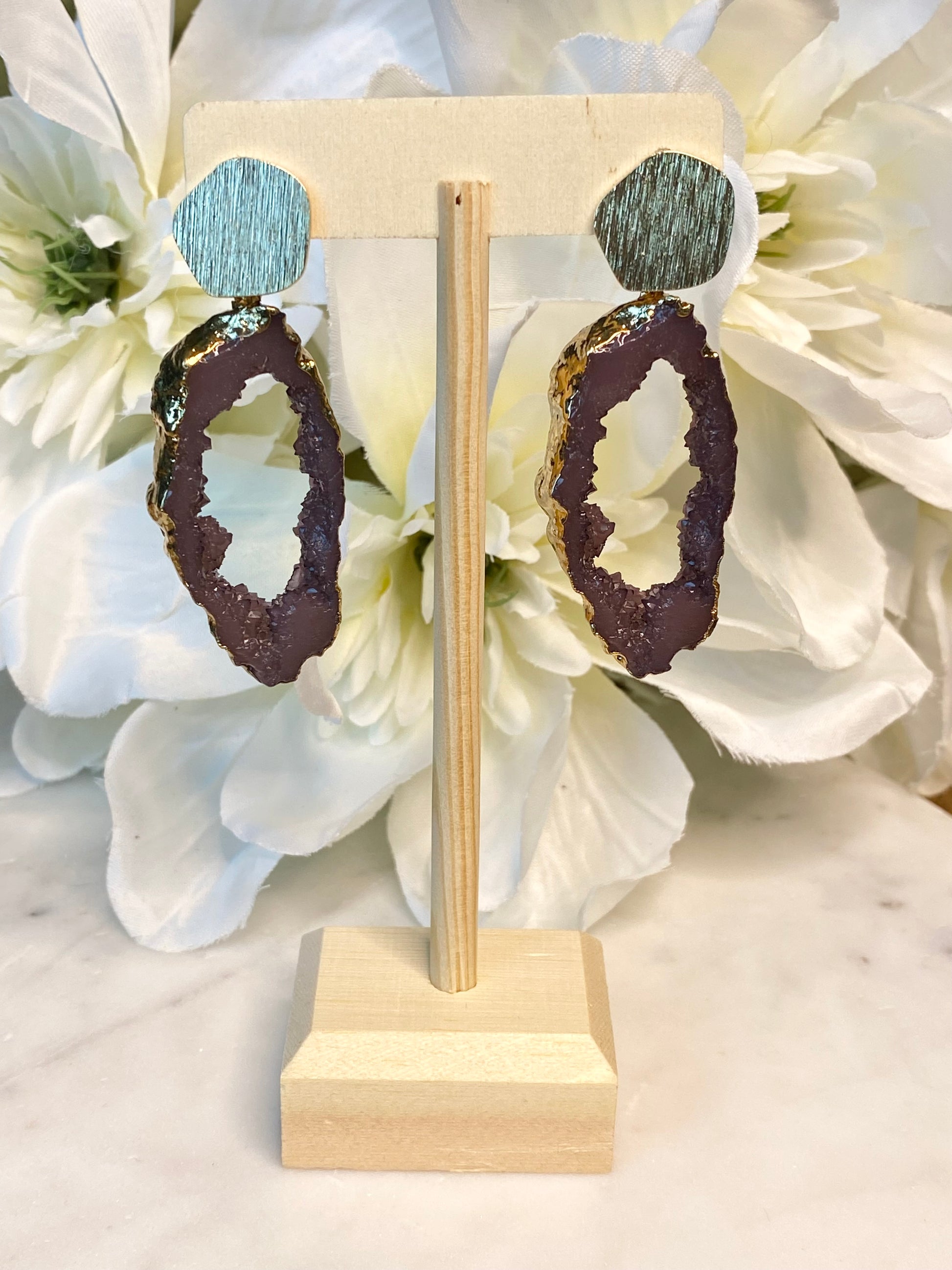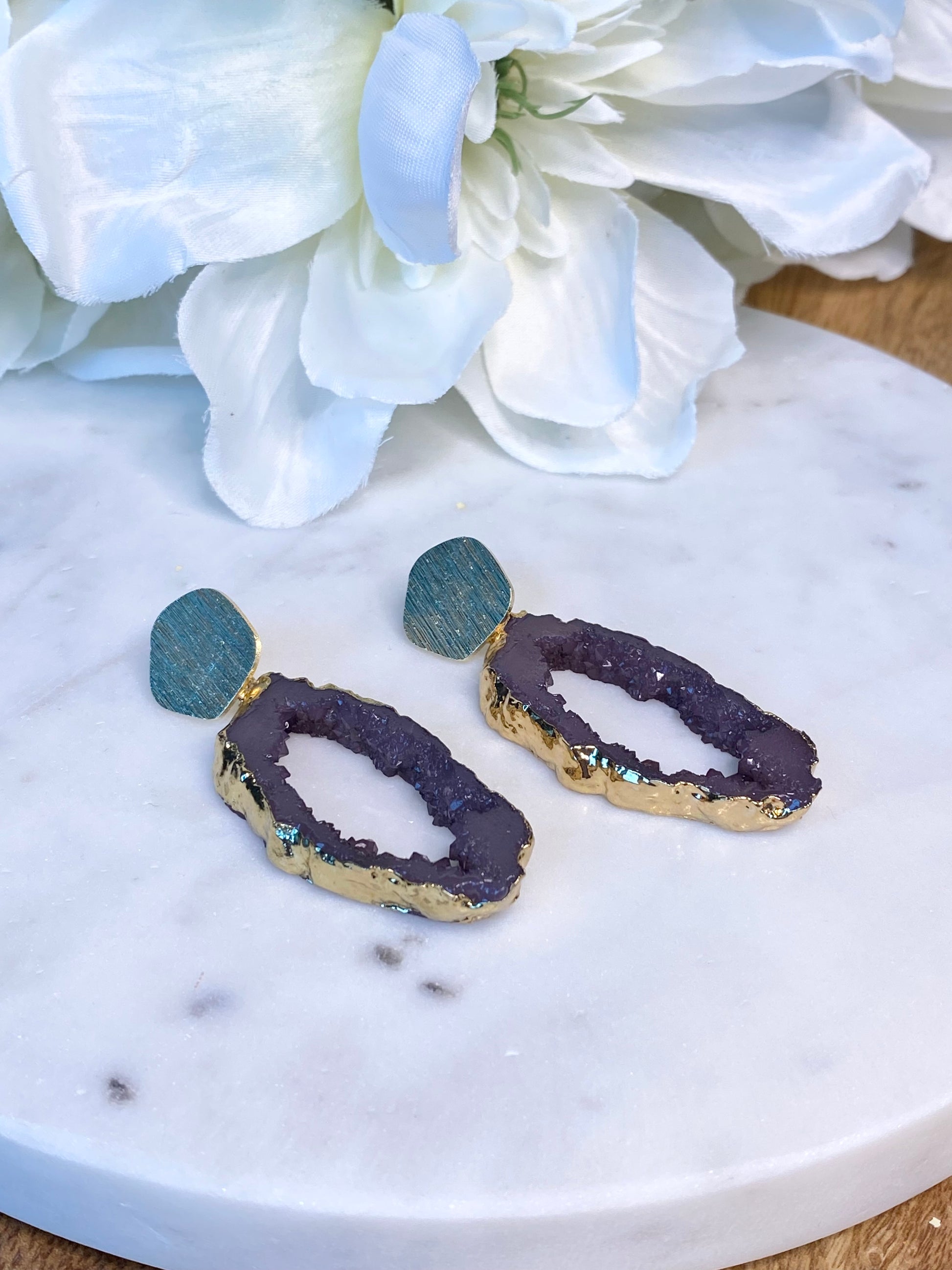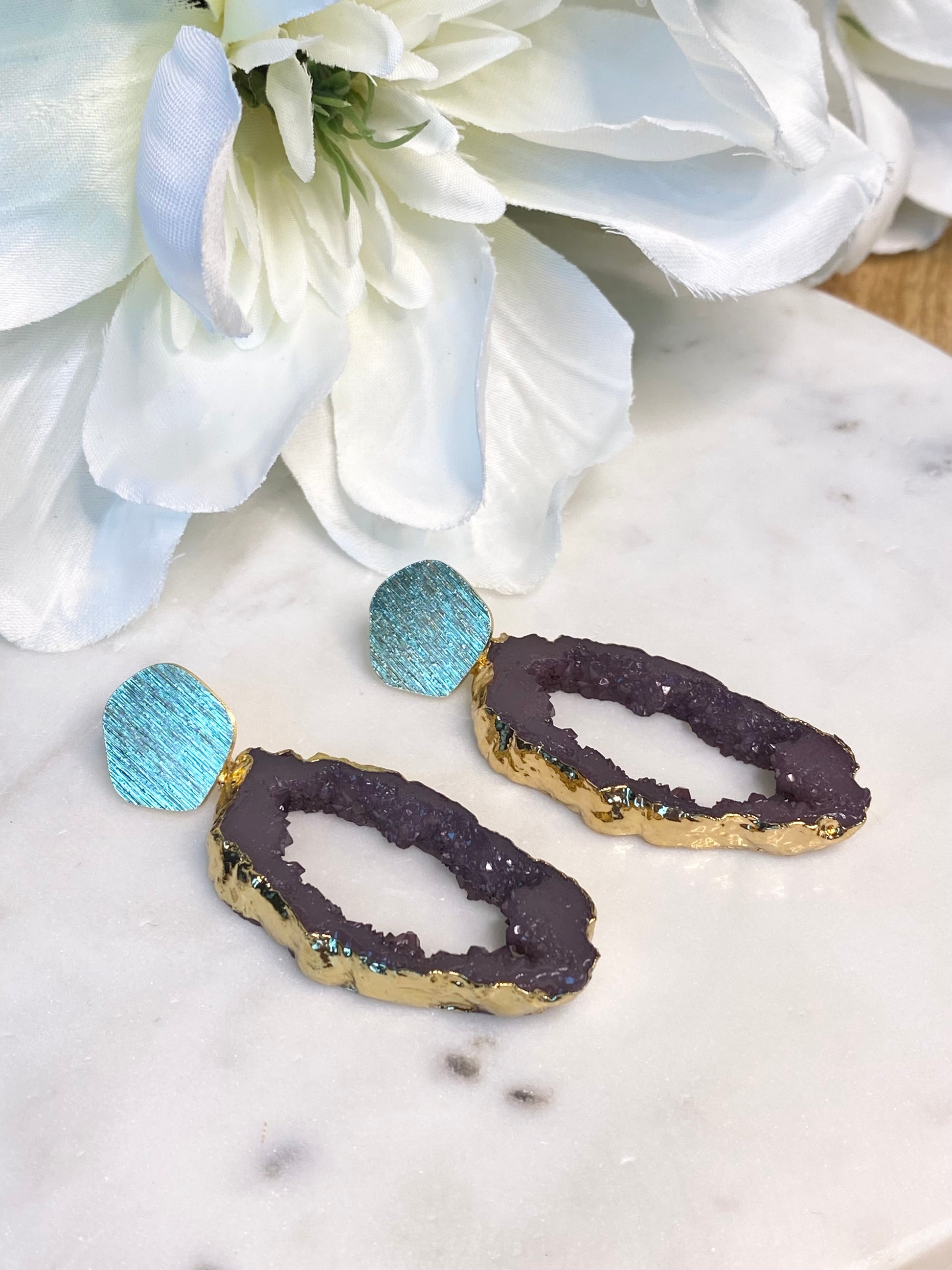 Real gold plated studs, blue-gray oval imitation druzy pendant.