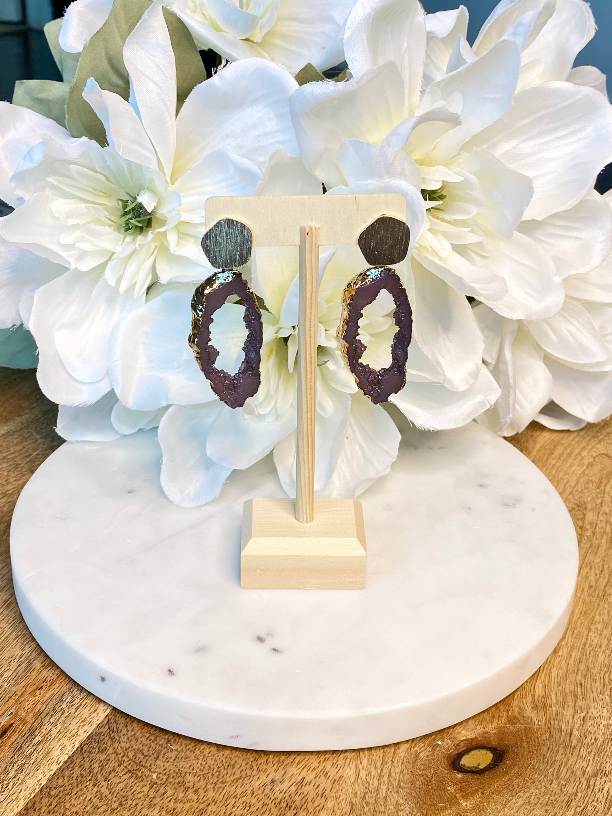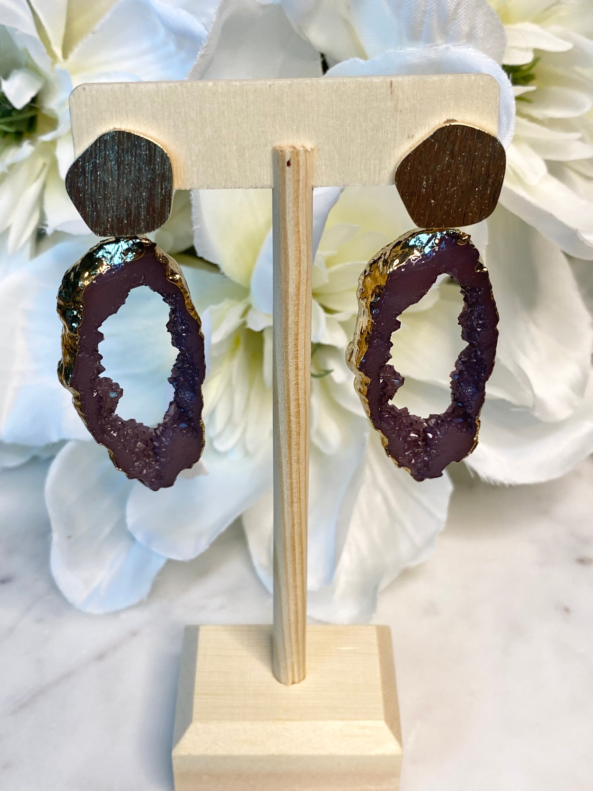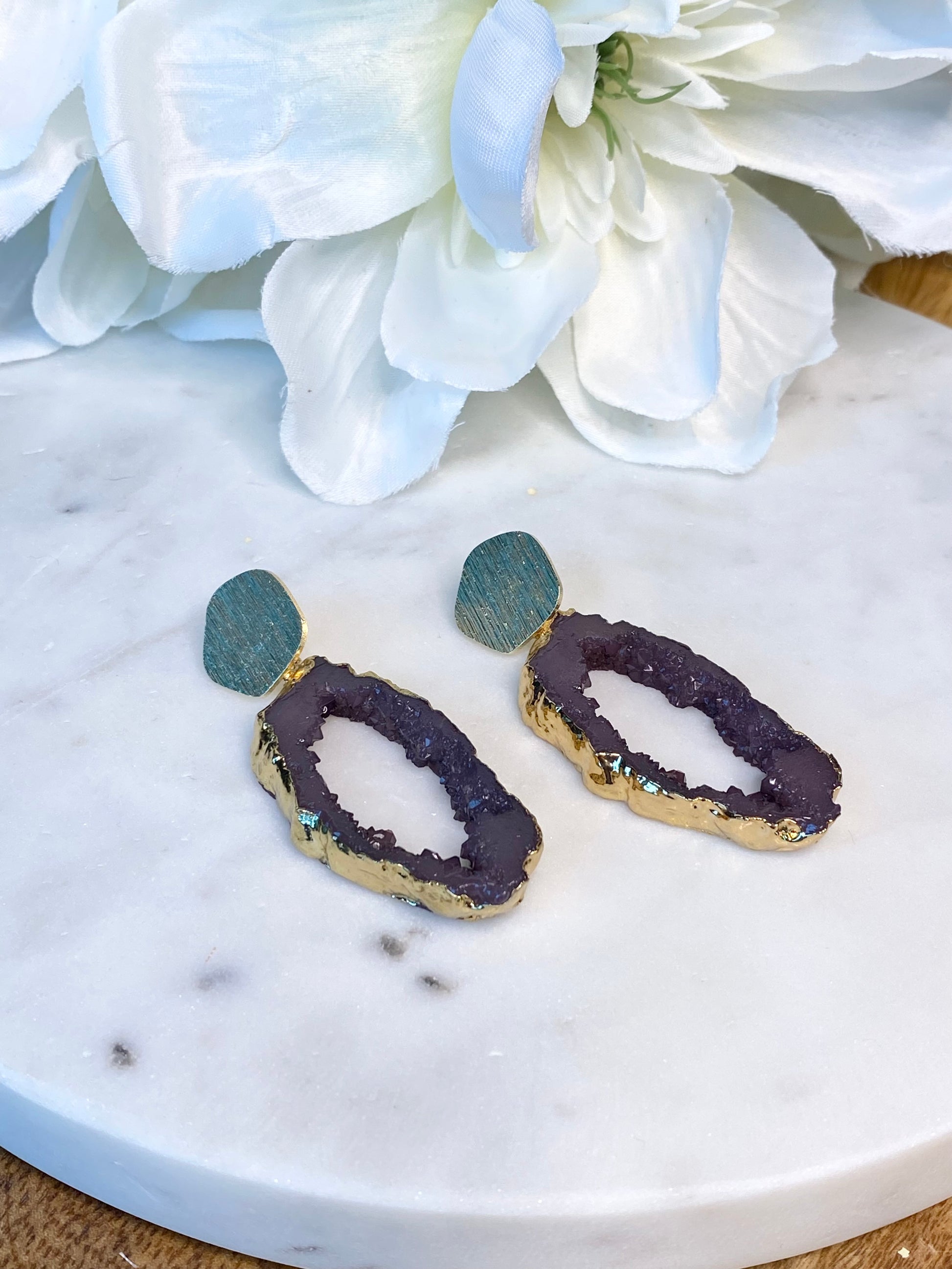 Real gold plated studs, blue-gray oval imitation druzy pendant.