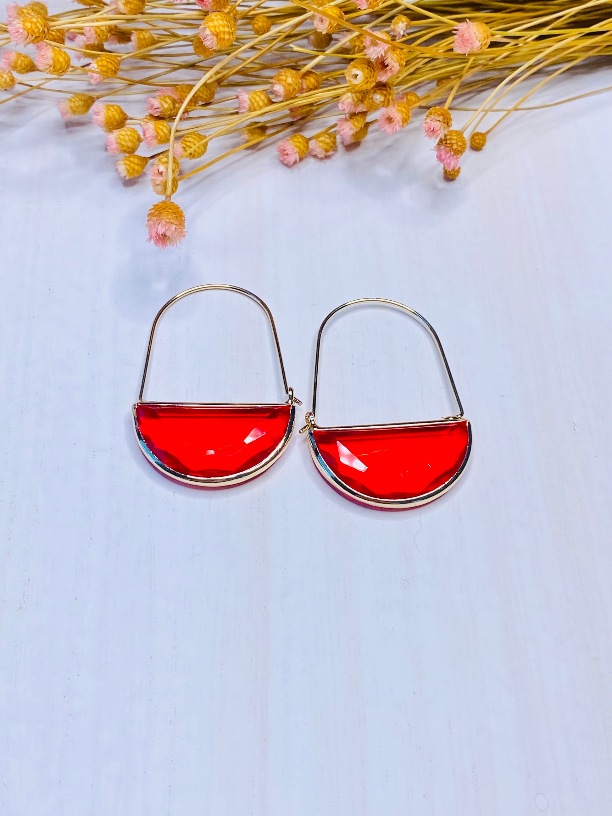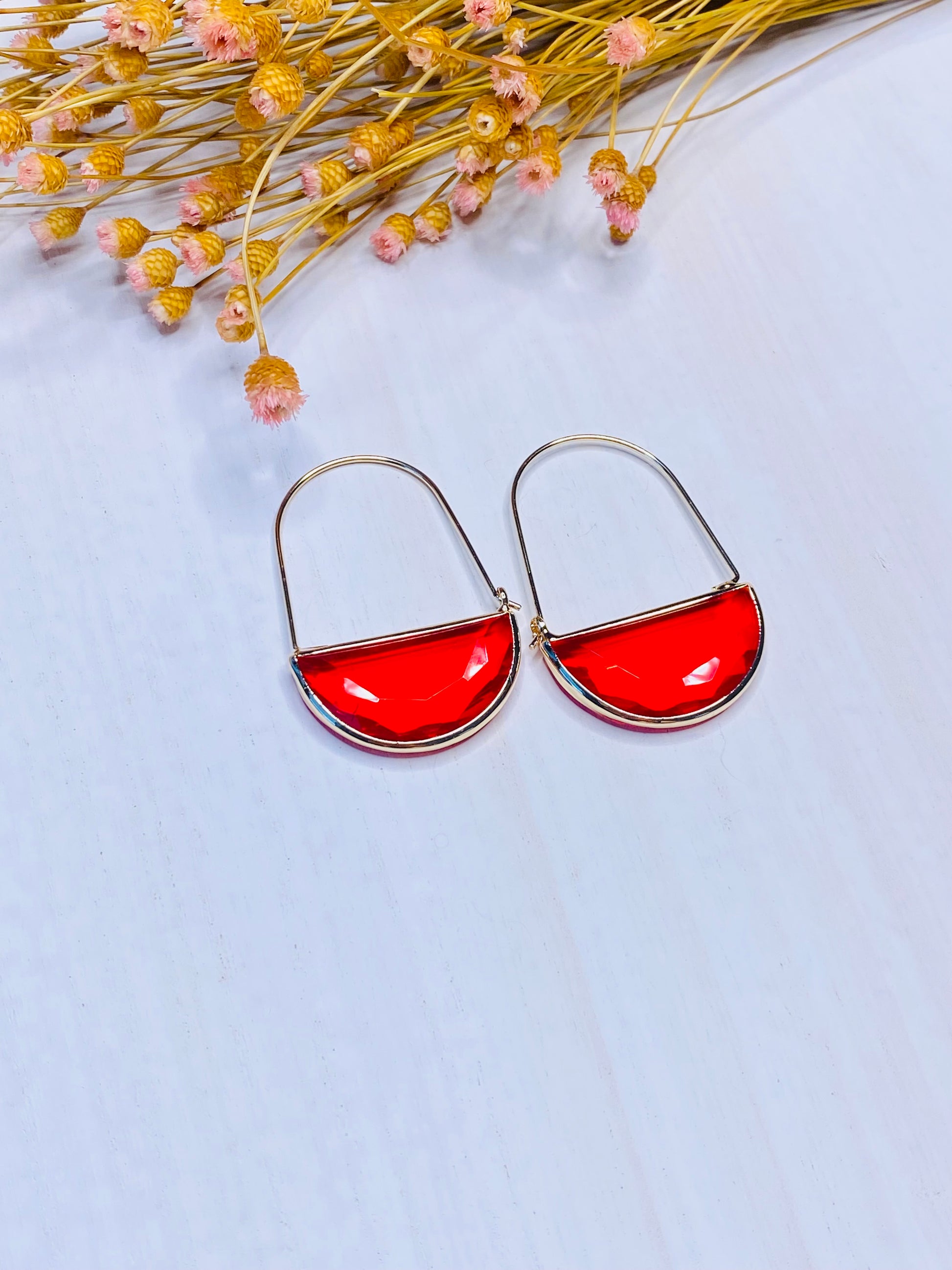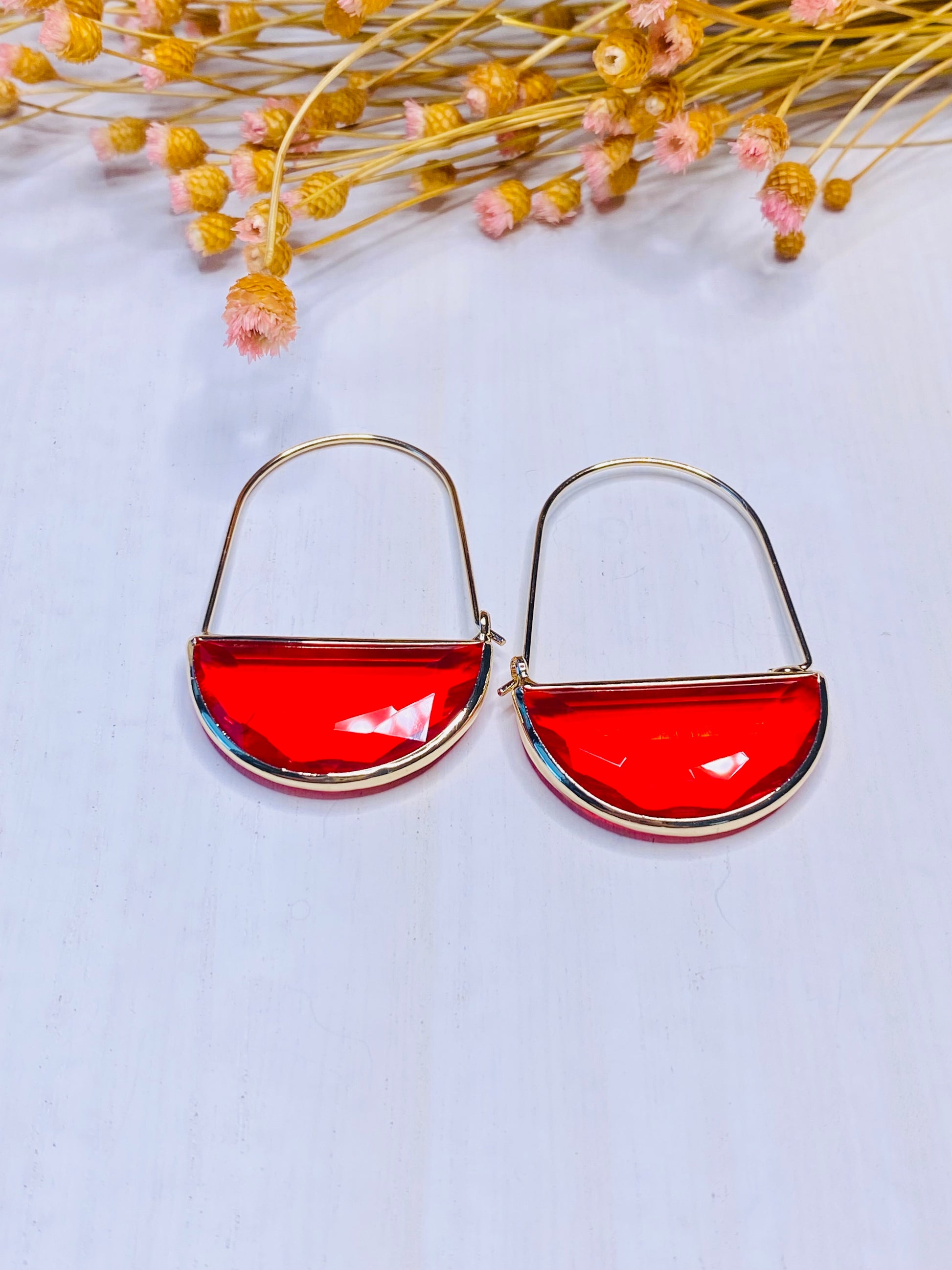 Gold plated dangle hoops, red half moon crystal glass gemstone