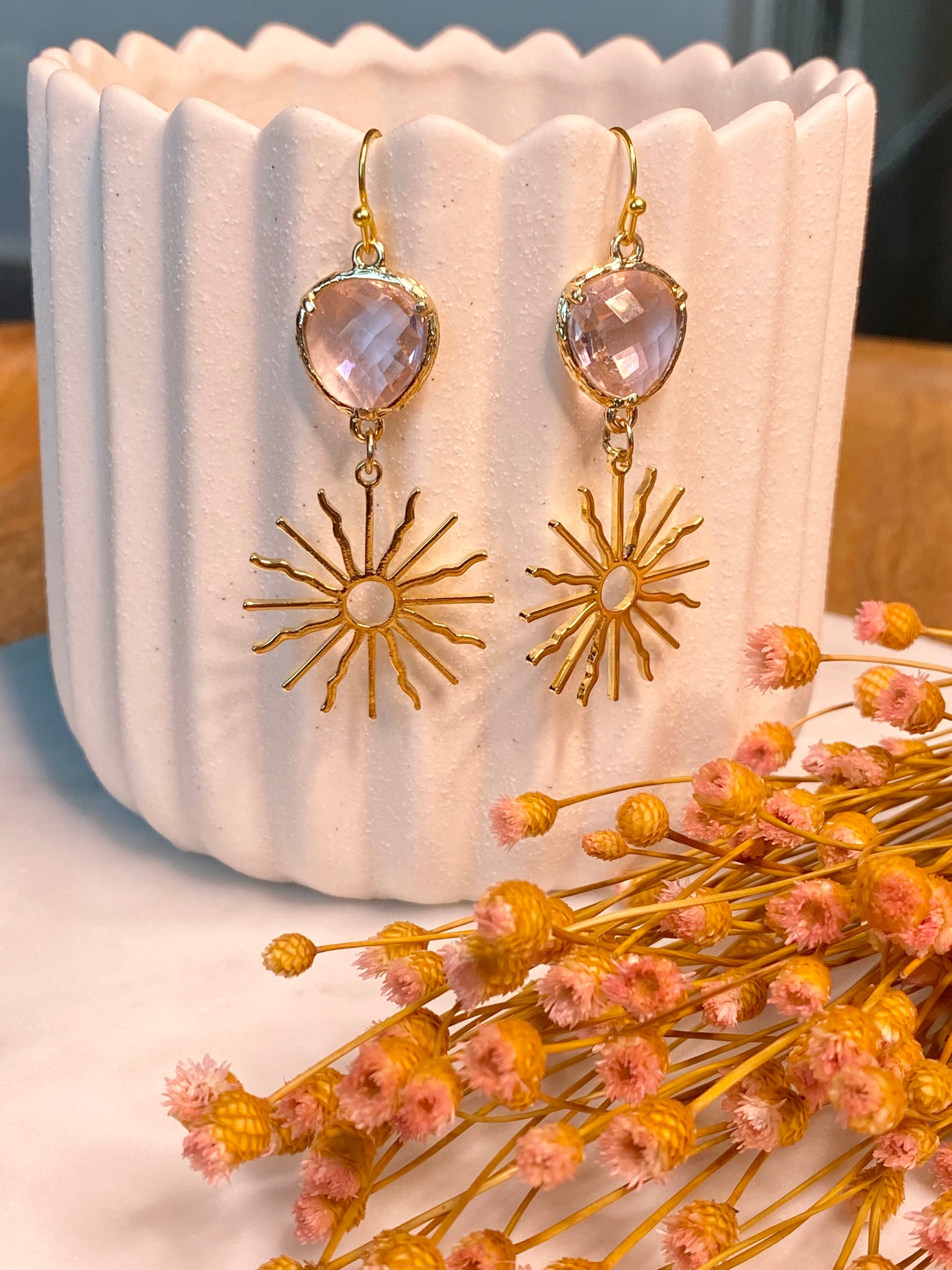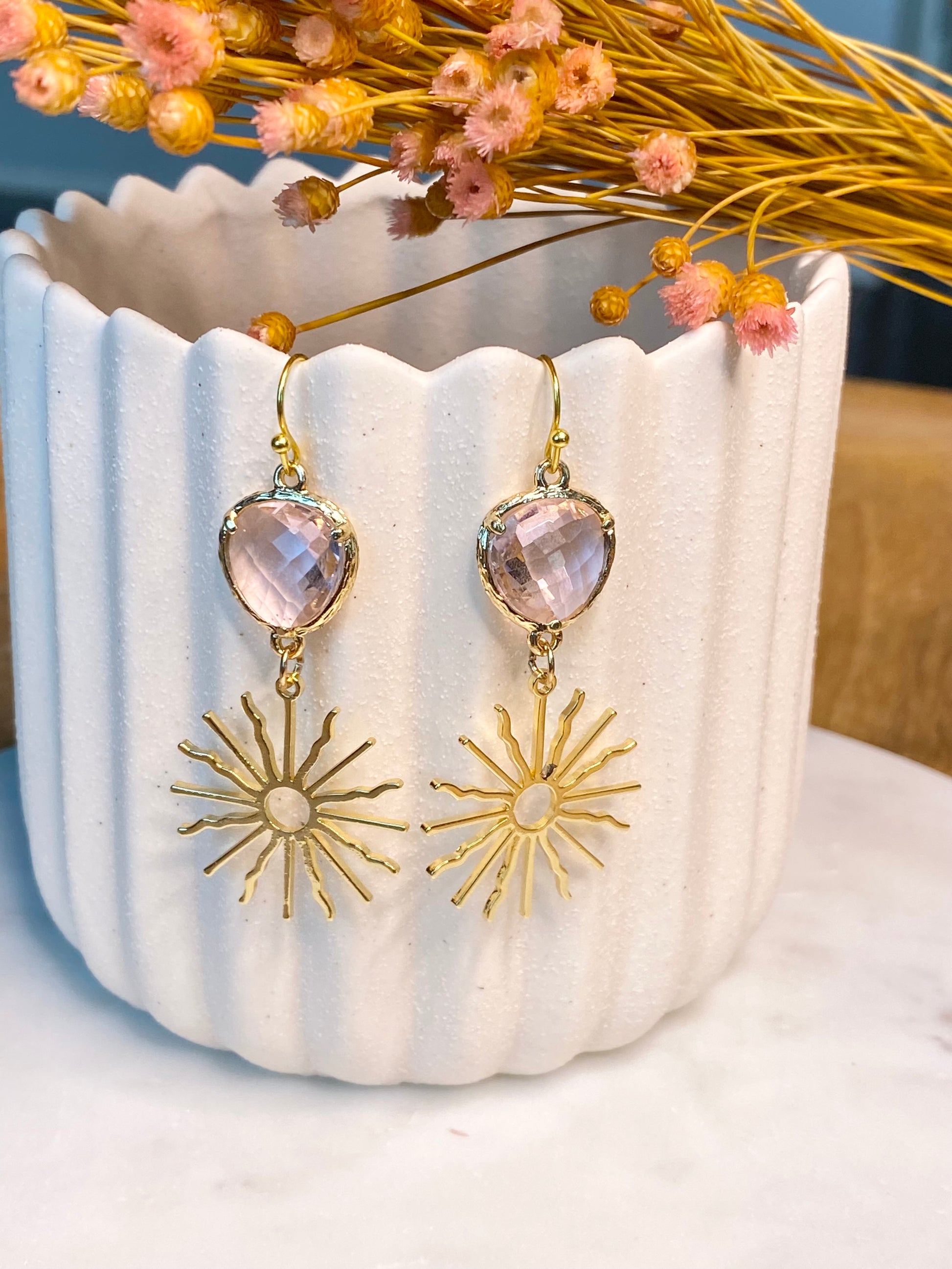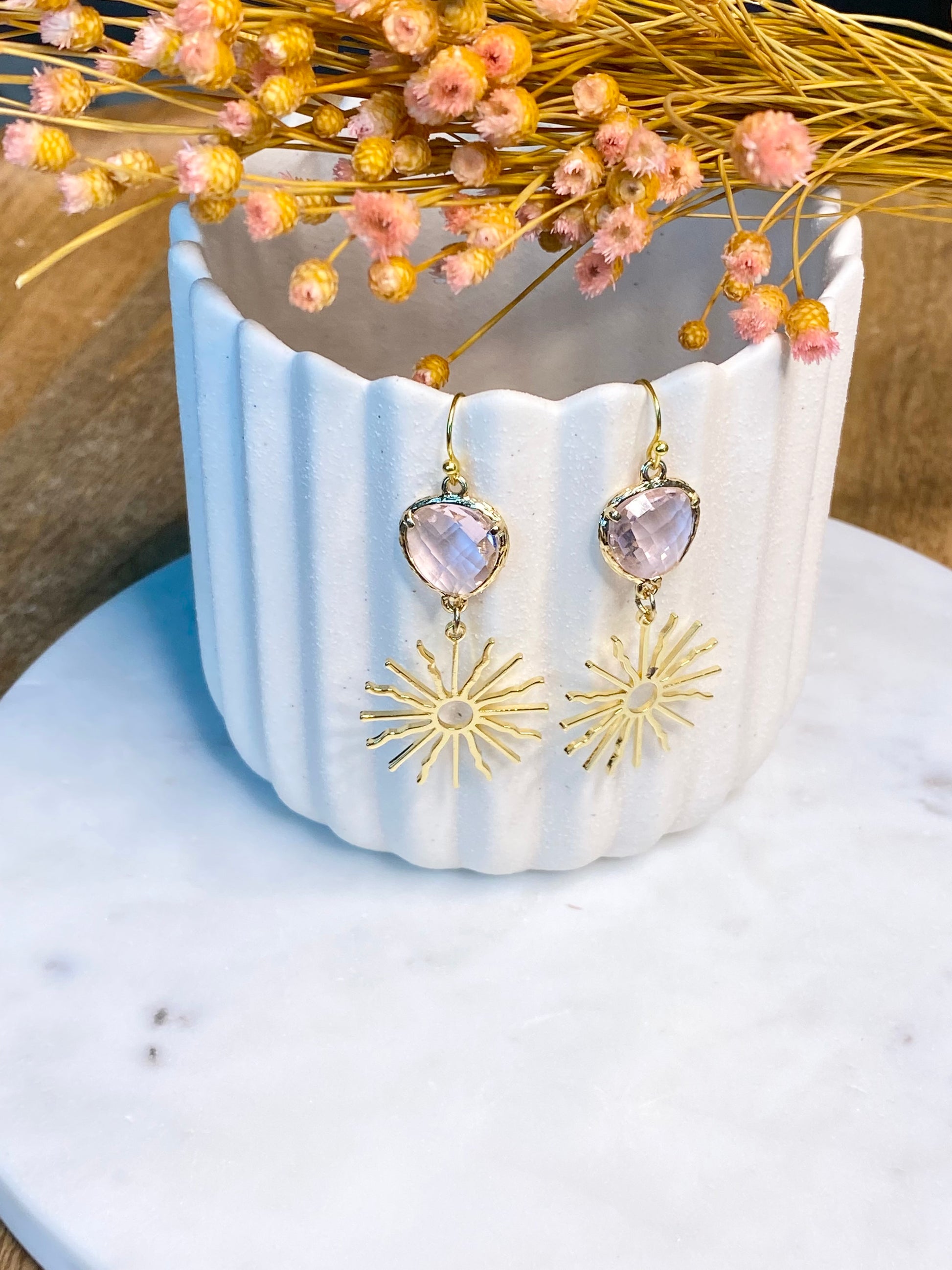 Soft Pink crystal glass gemstone, gold plated sunshine pendant.
