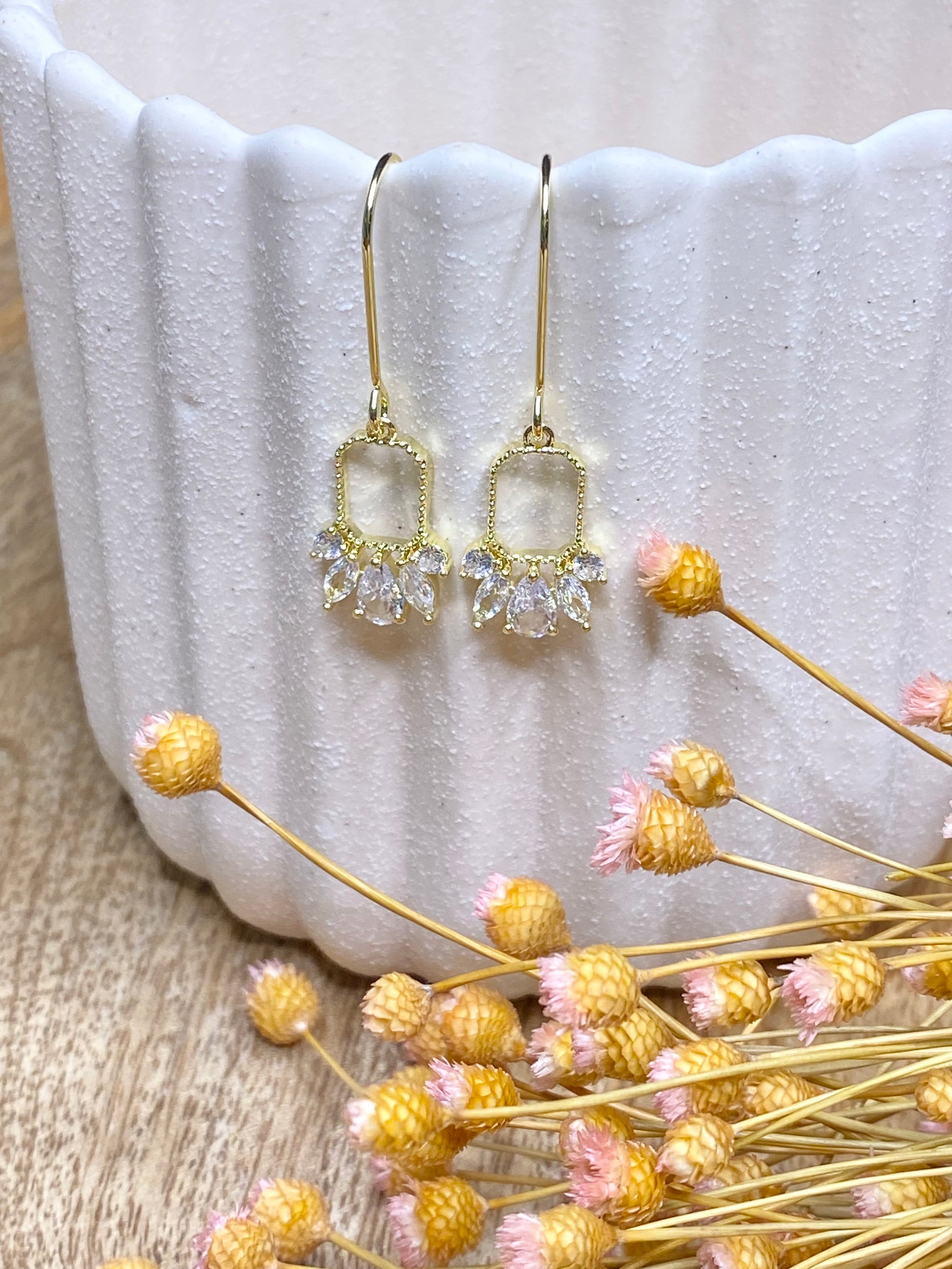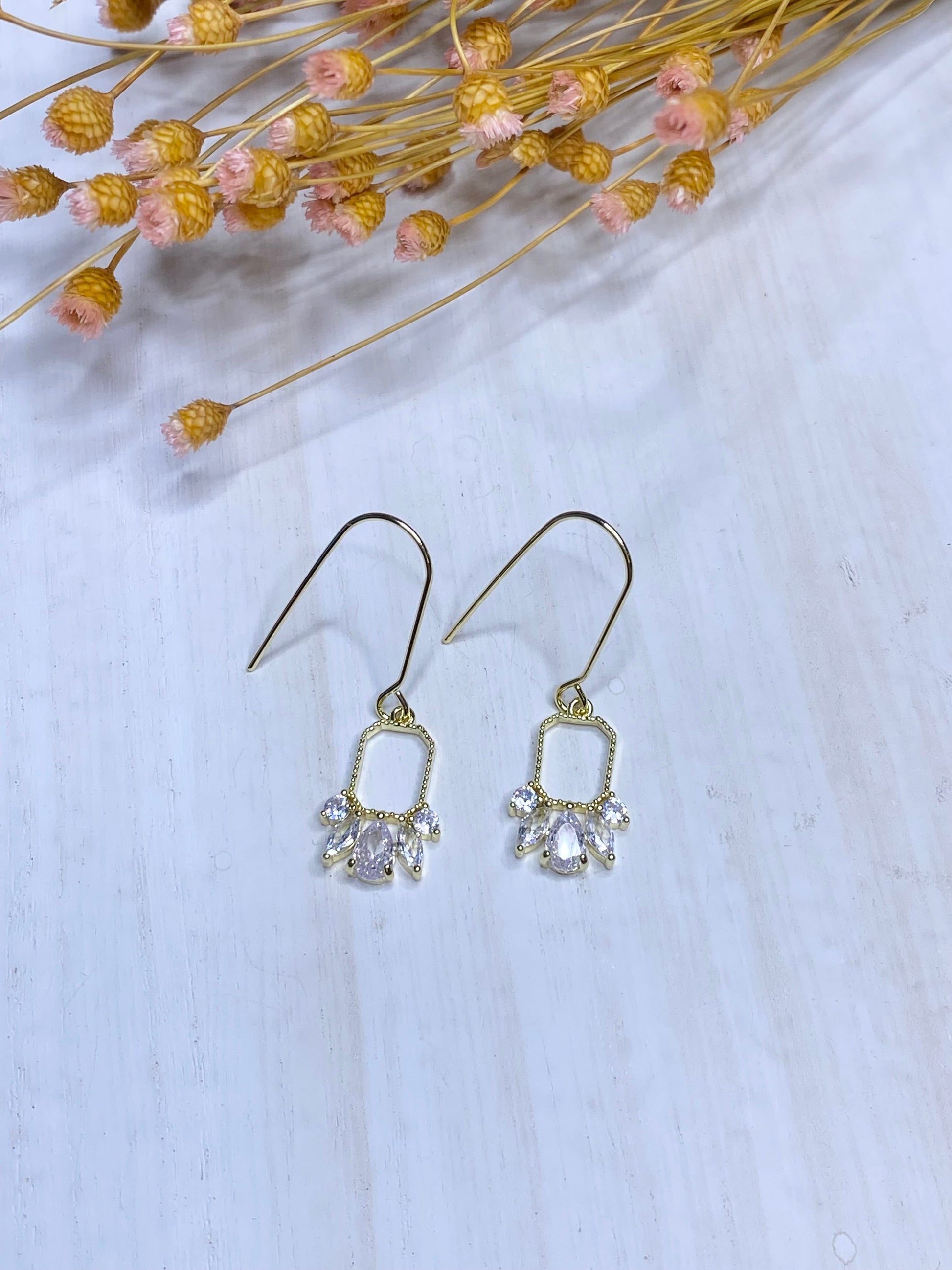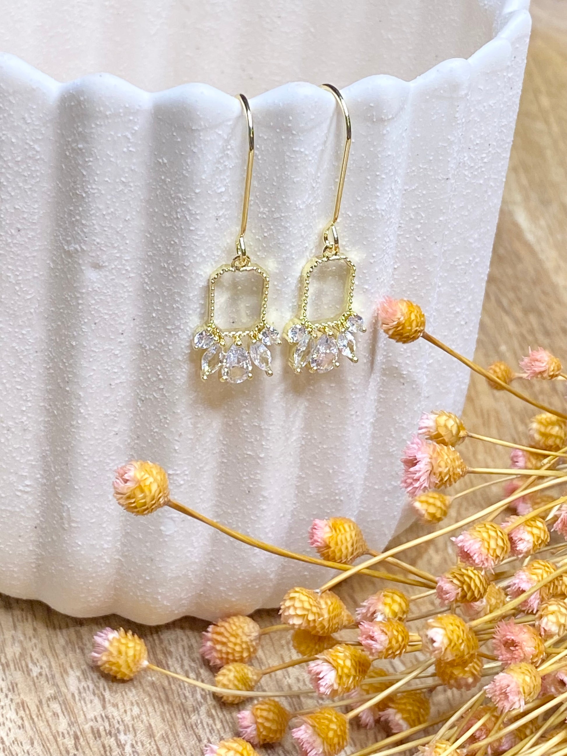 Dainty elegant 18k gold plated drop earring wire, gold plated zircon pendant.