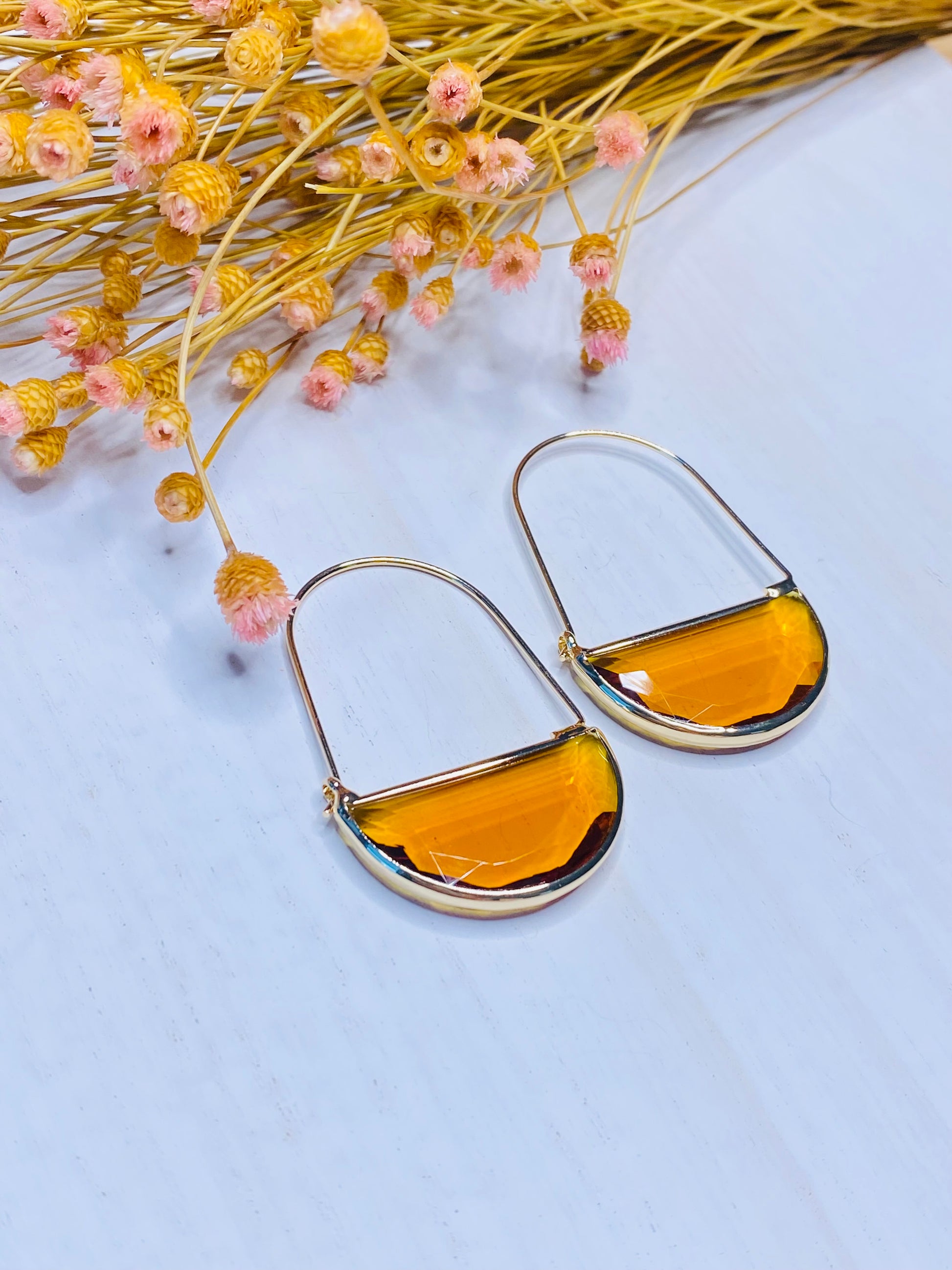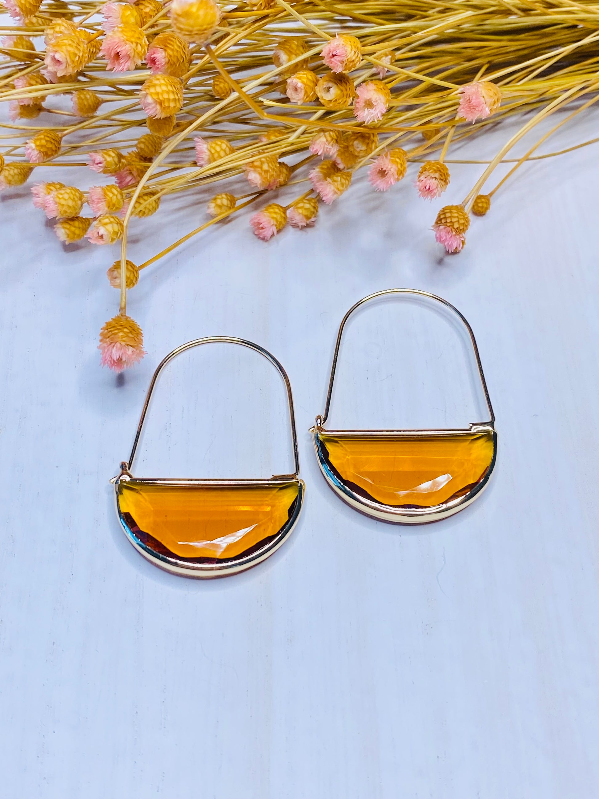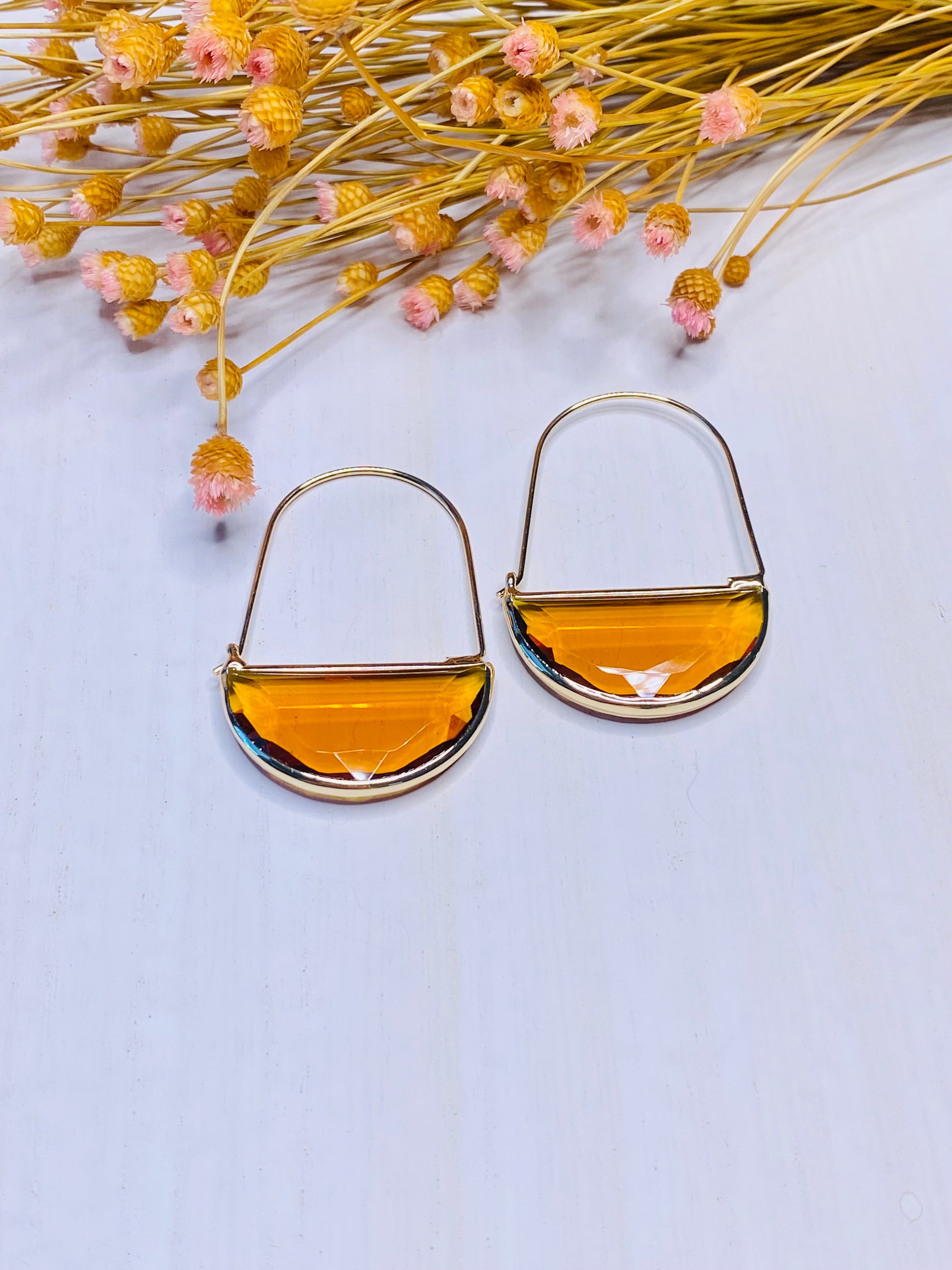 Gold plated dangle hoops, rust orange half moon crystal glass gemstone