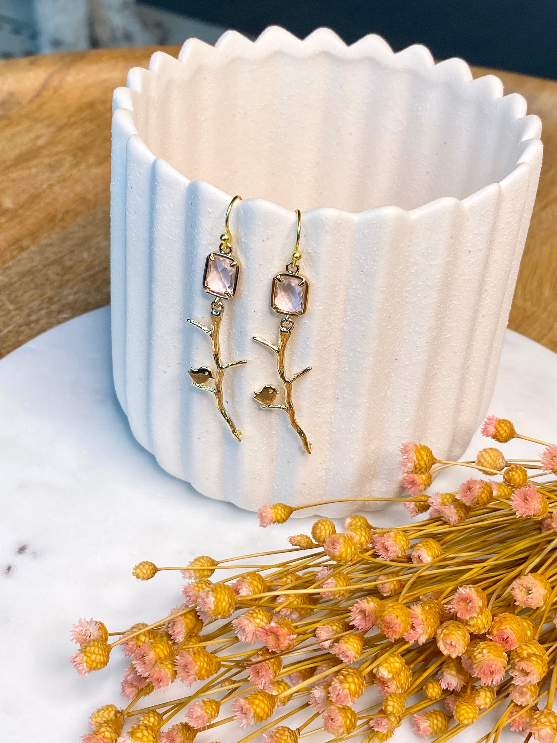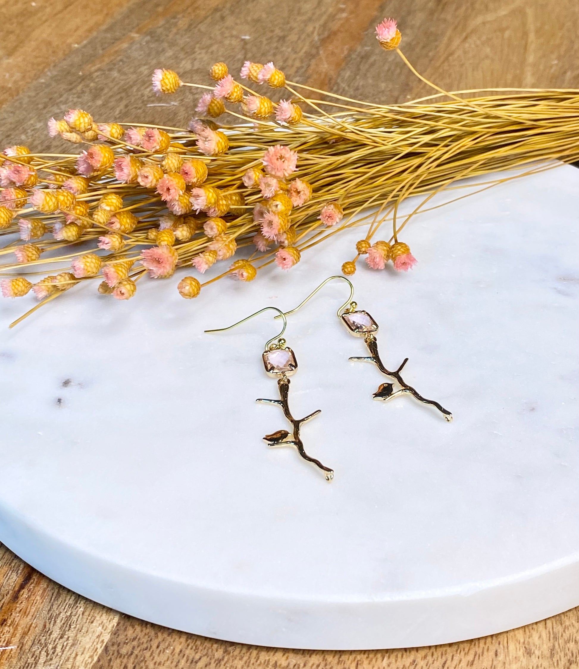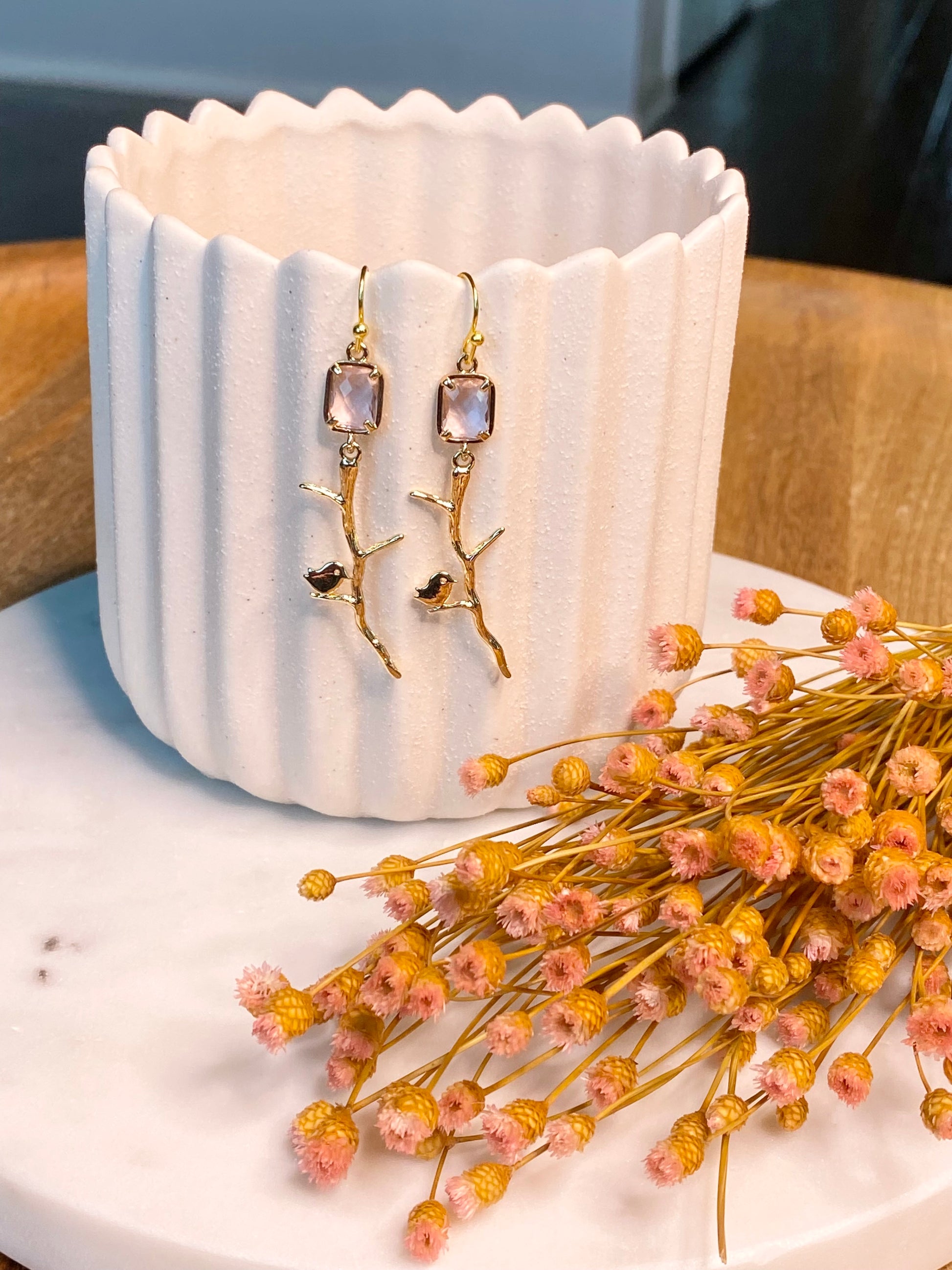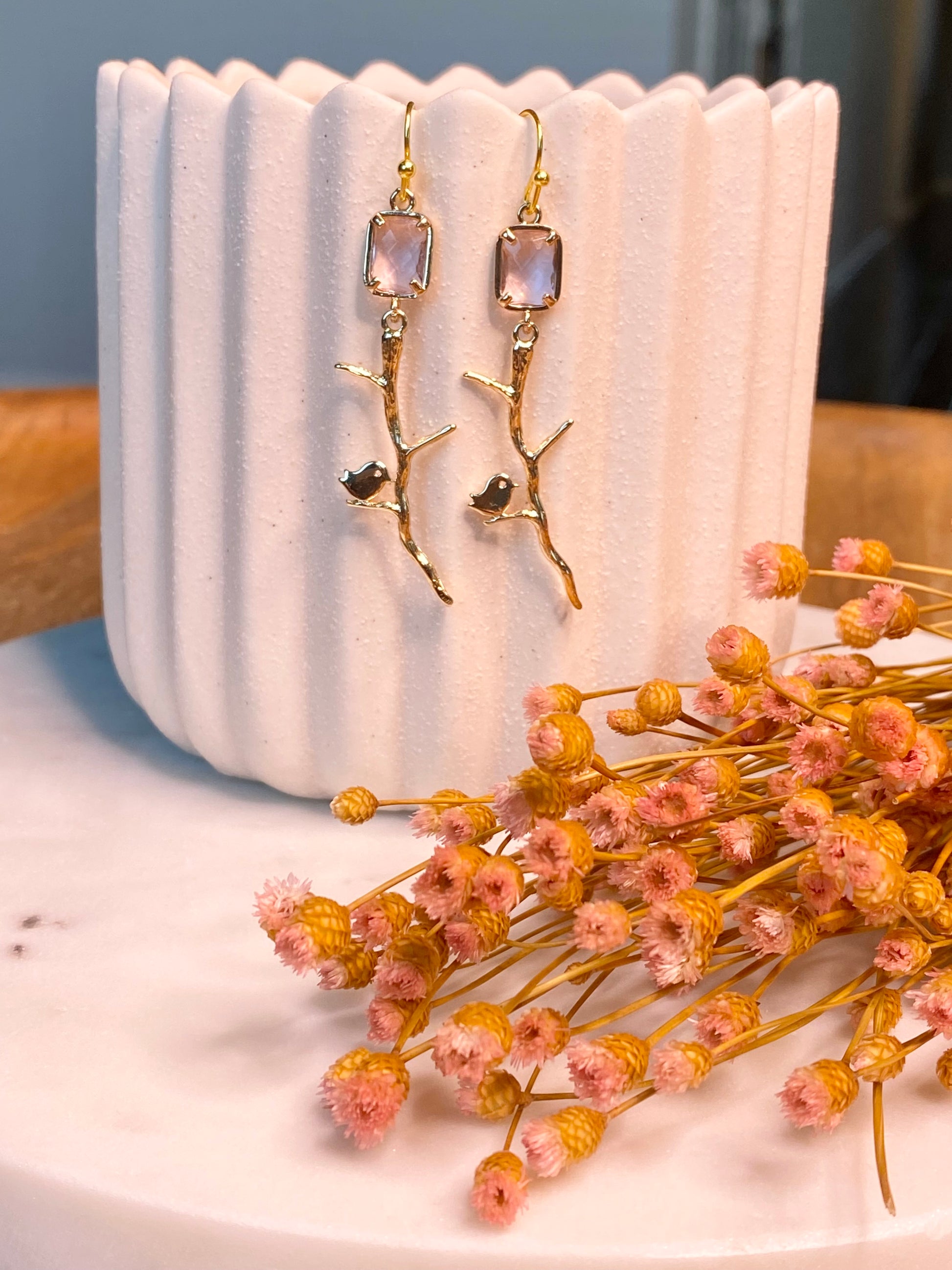 Pink crystal glass gemstone, real gold plated tree branch with perched bird.